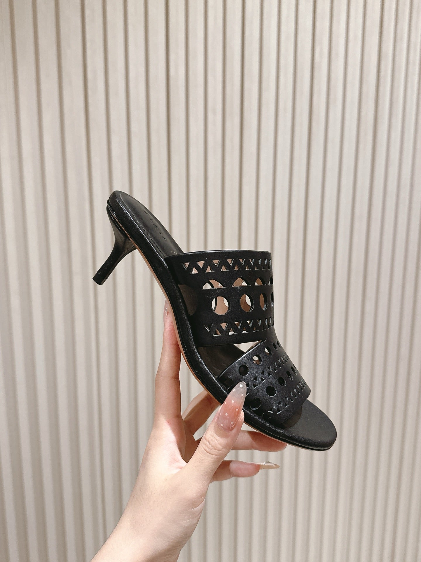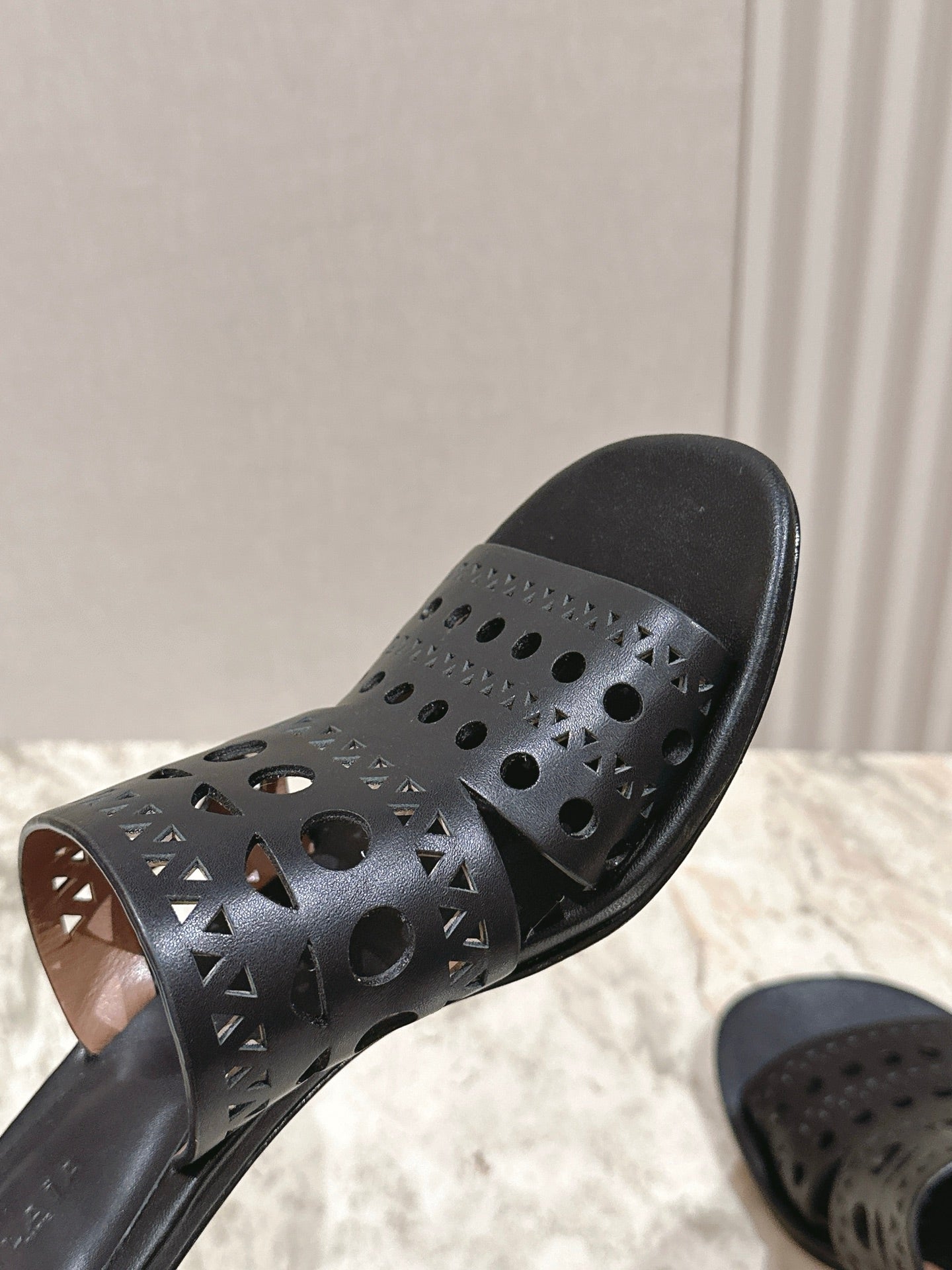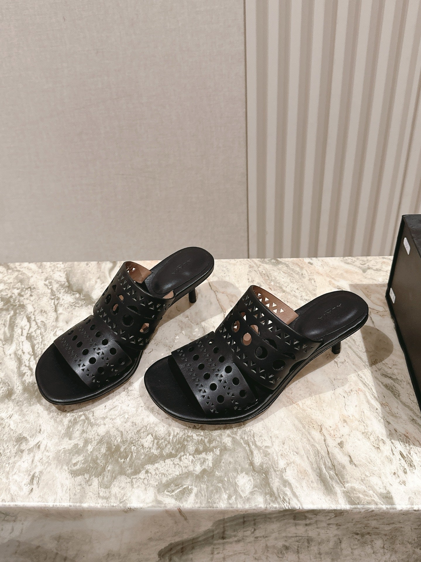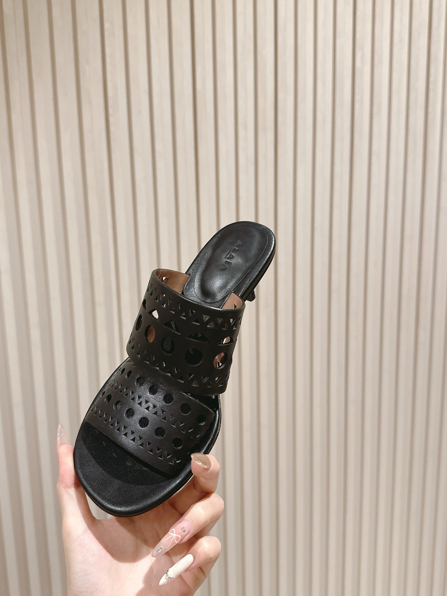 Alaia 2025 Vienne Cutout Kitten-Heel Slide Sandals Black Leather 293648