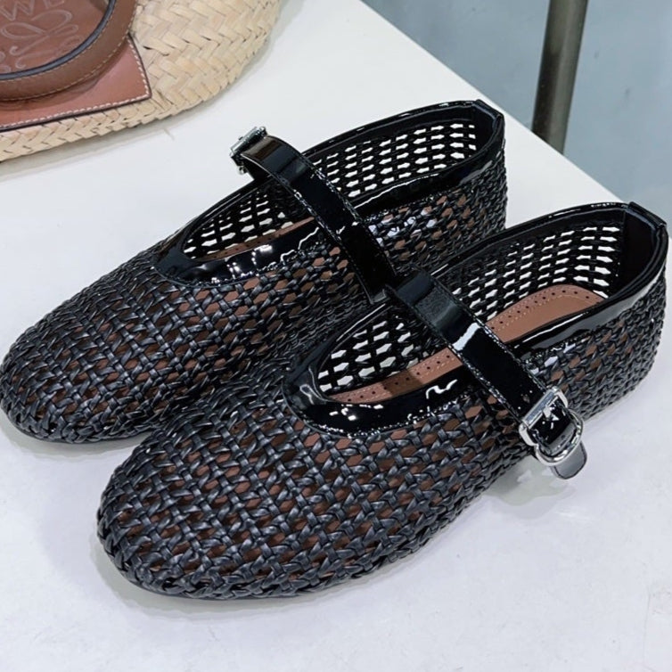 ALAIA MARY JANE FLATS black woven calfskin pattent