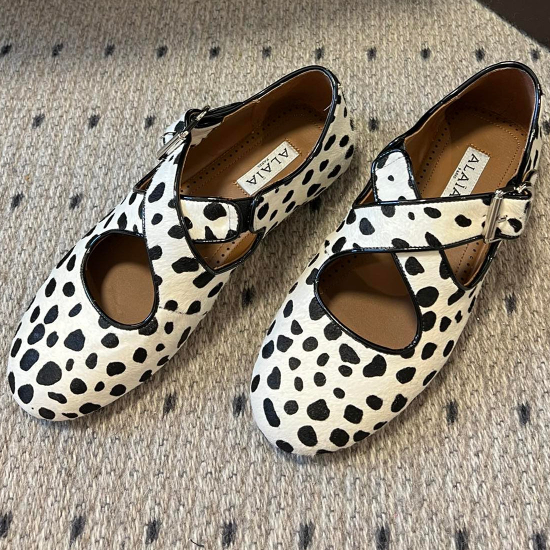 Alaia 25 Criss Cross With Stud Ballet Flats Black White Suede Sheepskin 303694