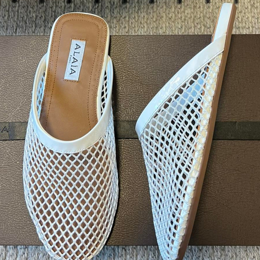 Alaia 25 Fishnet Flat Mules White Lampskin 303681