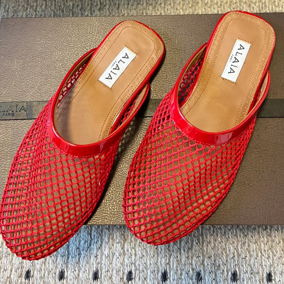 Alaia 25 Fishnet Flat Mules Red Lampskin 303682