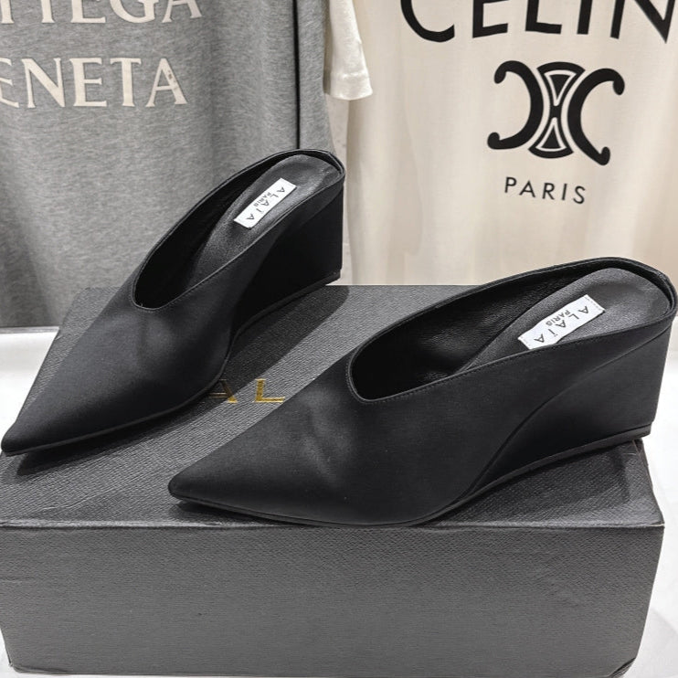 Alaia 25 Cube Wedge Mules Black Silk Sheepskin 300084