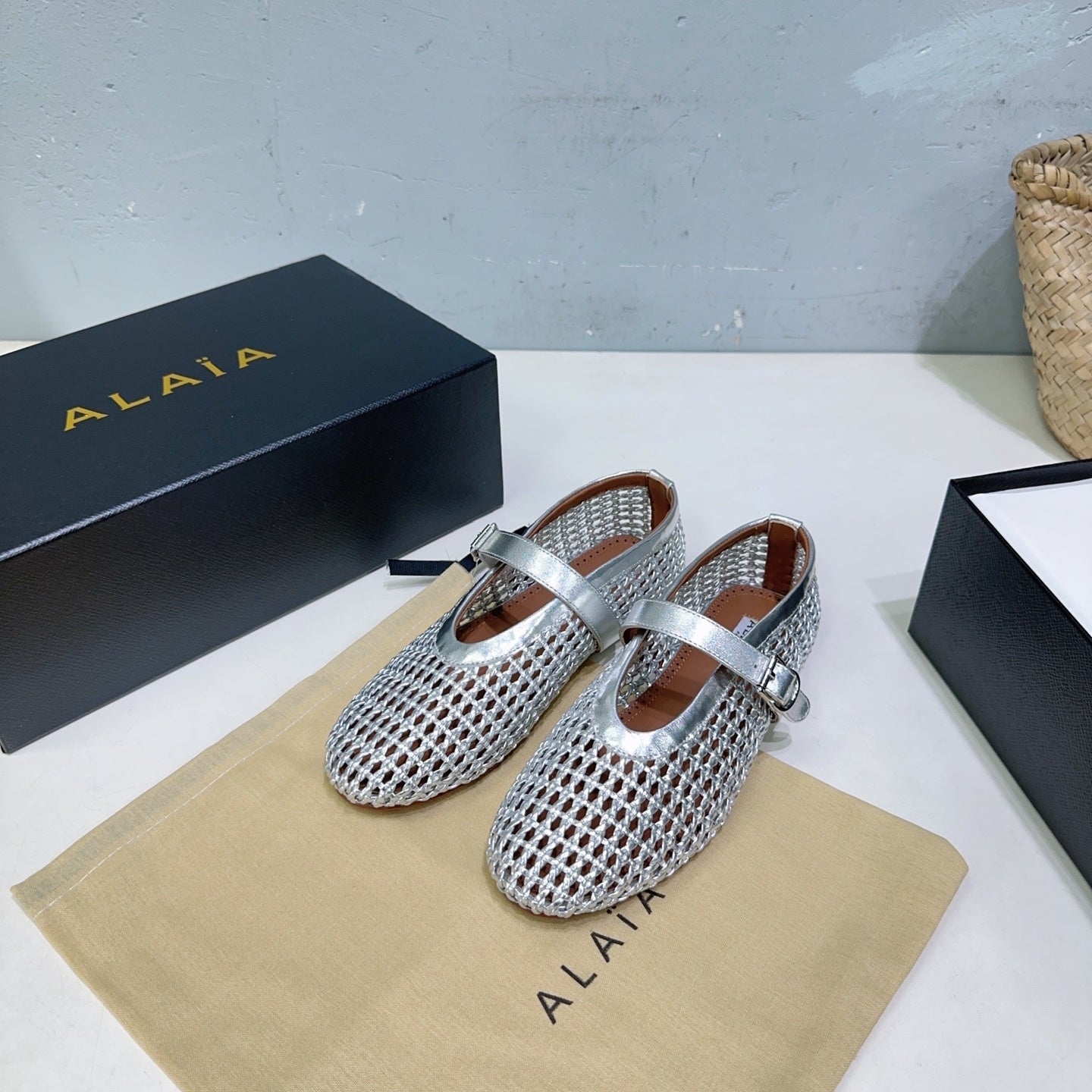 Alaia Braided Hollow Ballet Flats Silver Cowhide 300042