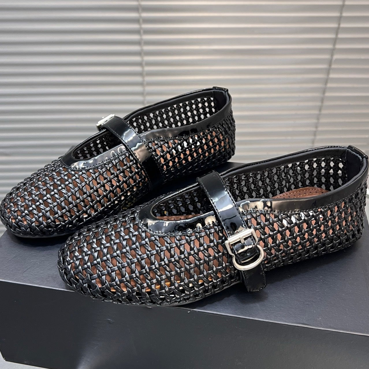 Alaia 25 Laminated Fishnet Ballet Flats Black Lambskin 576444
