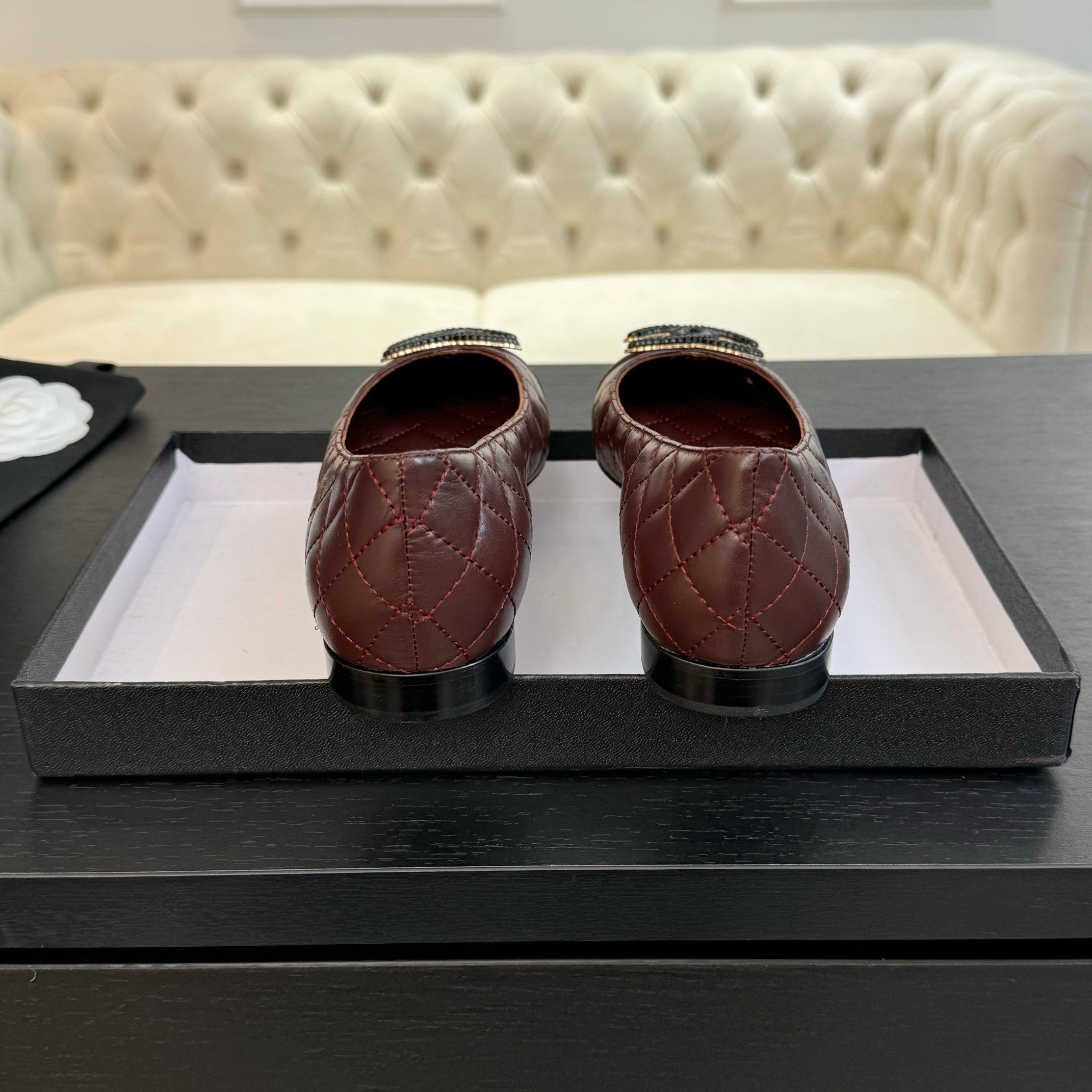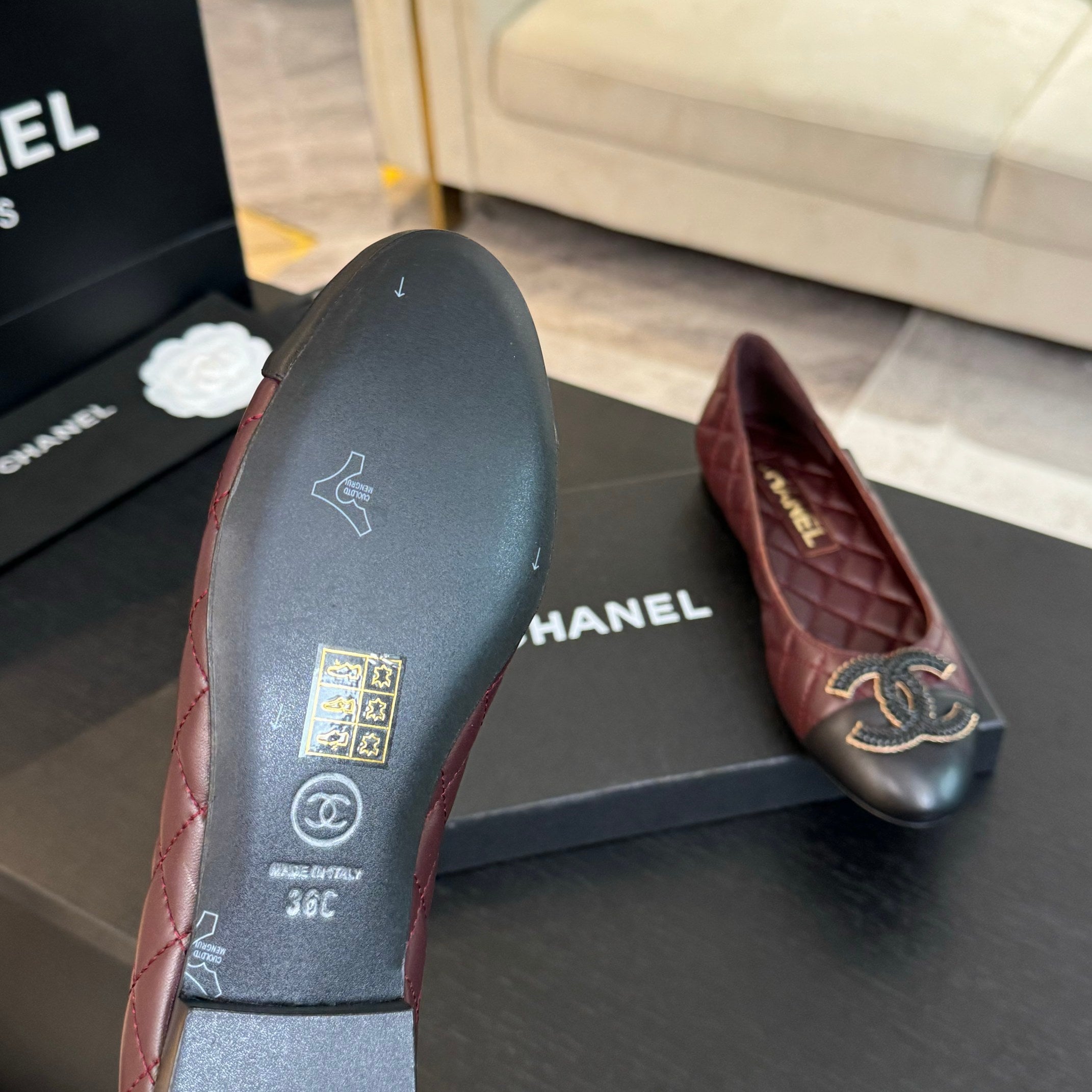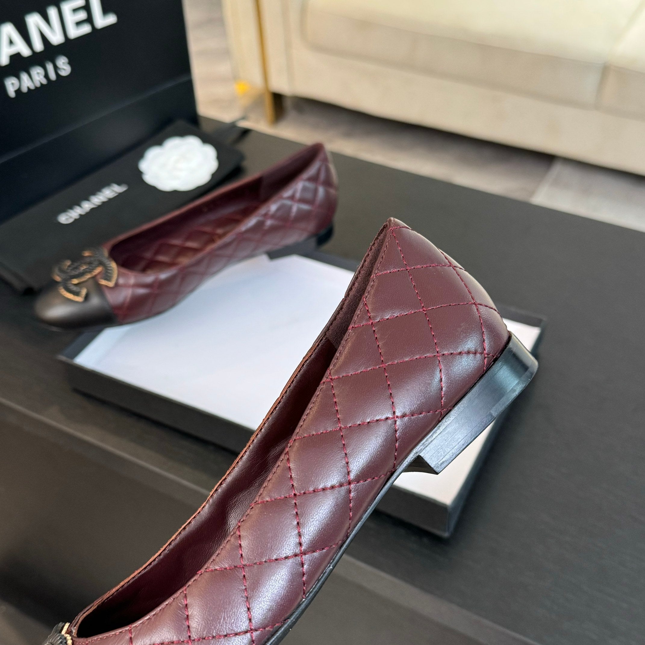 ballet flat burgundy quilted lambskin large black cc logo