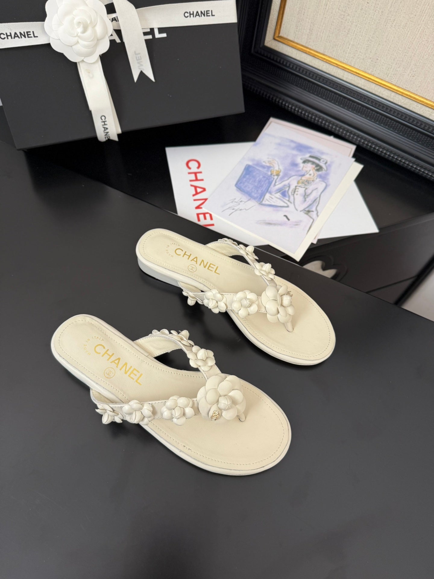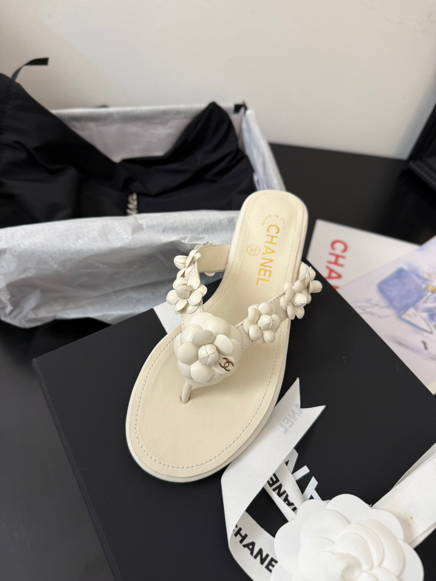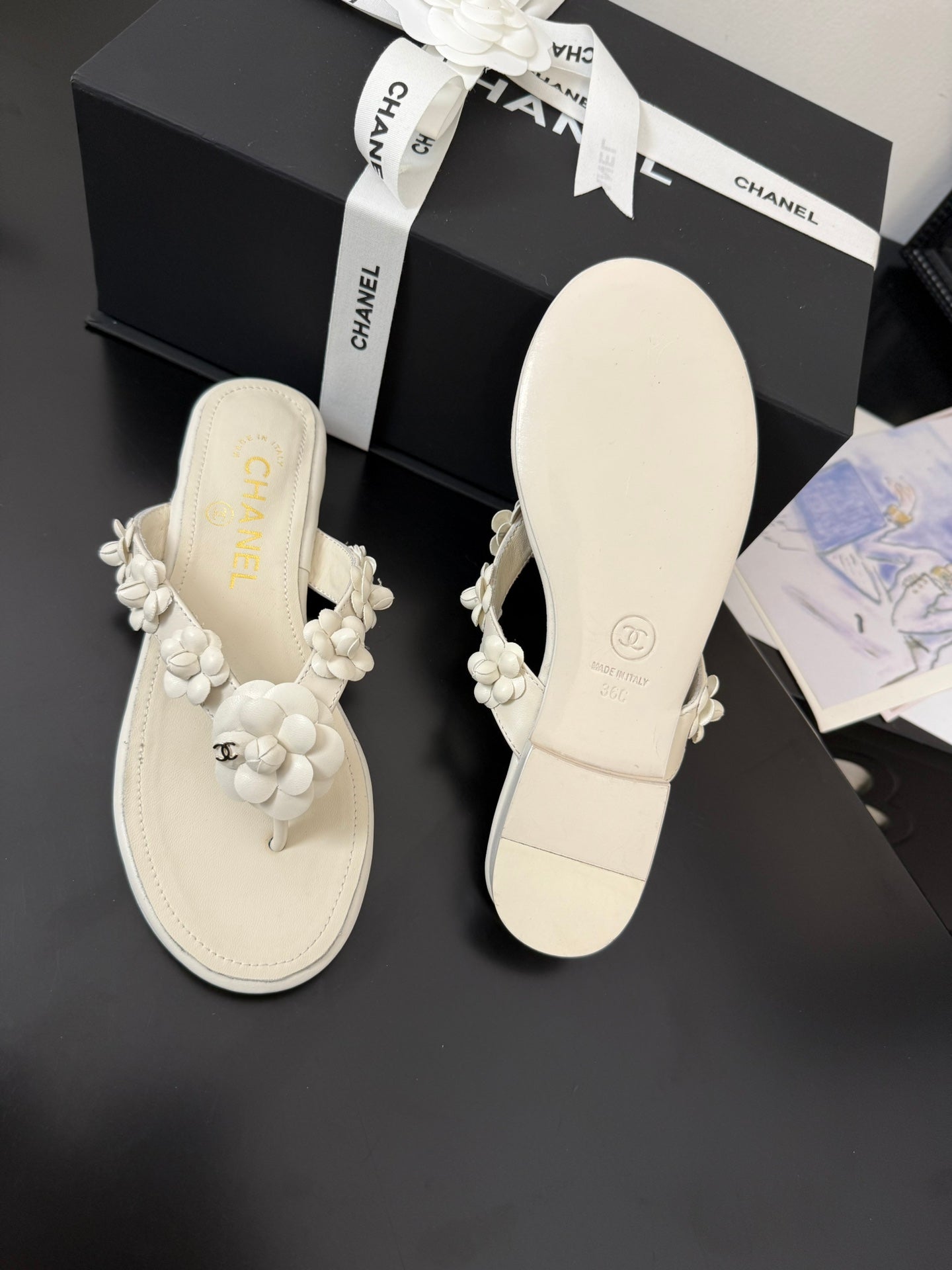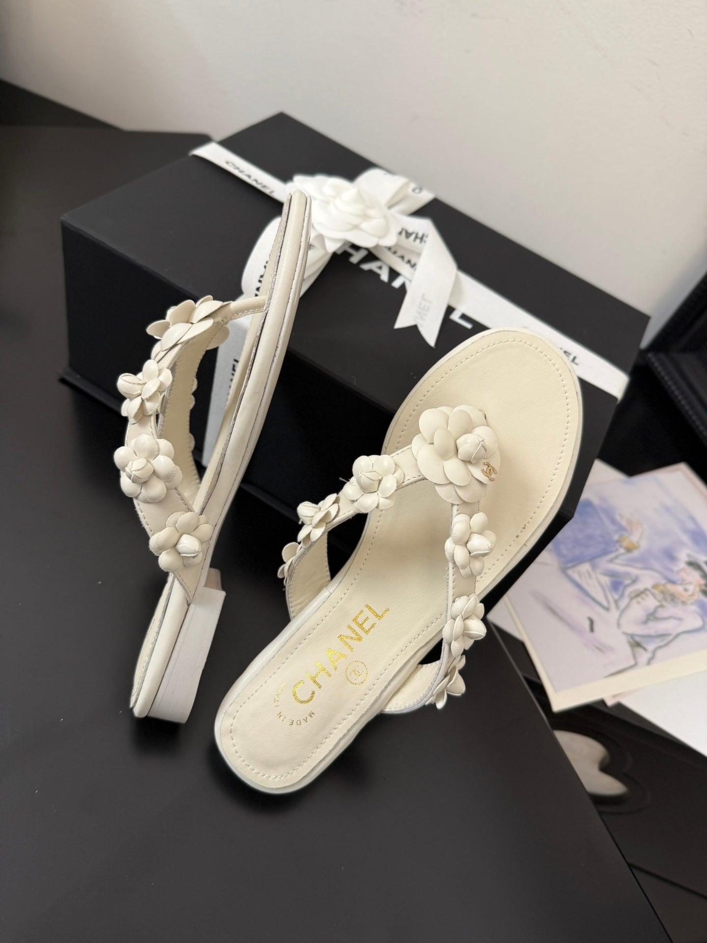 CC 25 Flower Thong Slippers White Cowhide 233415