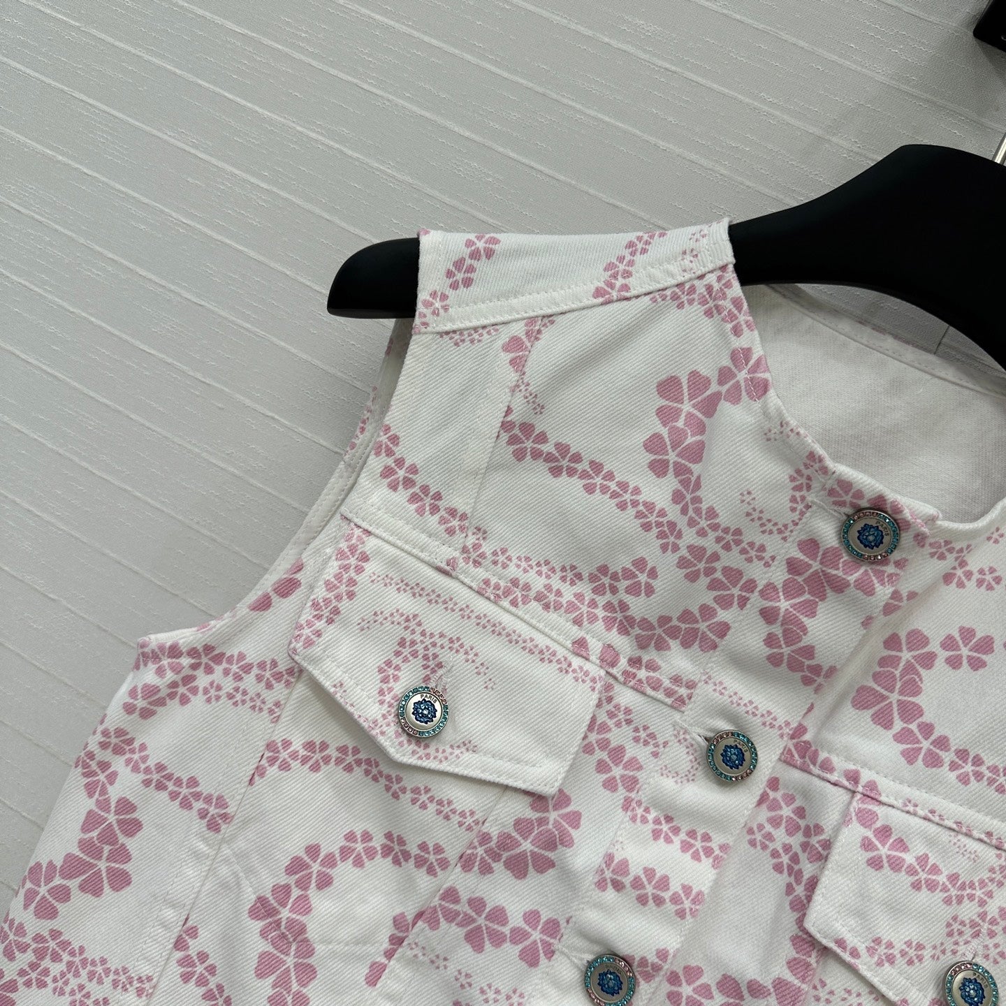 CC 25 Printed Denim Round Neck Vest Pink White Cotton