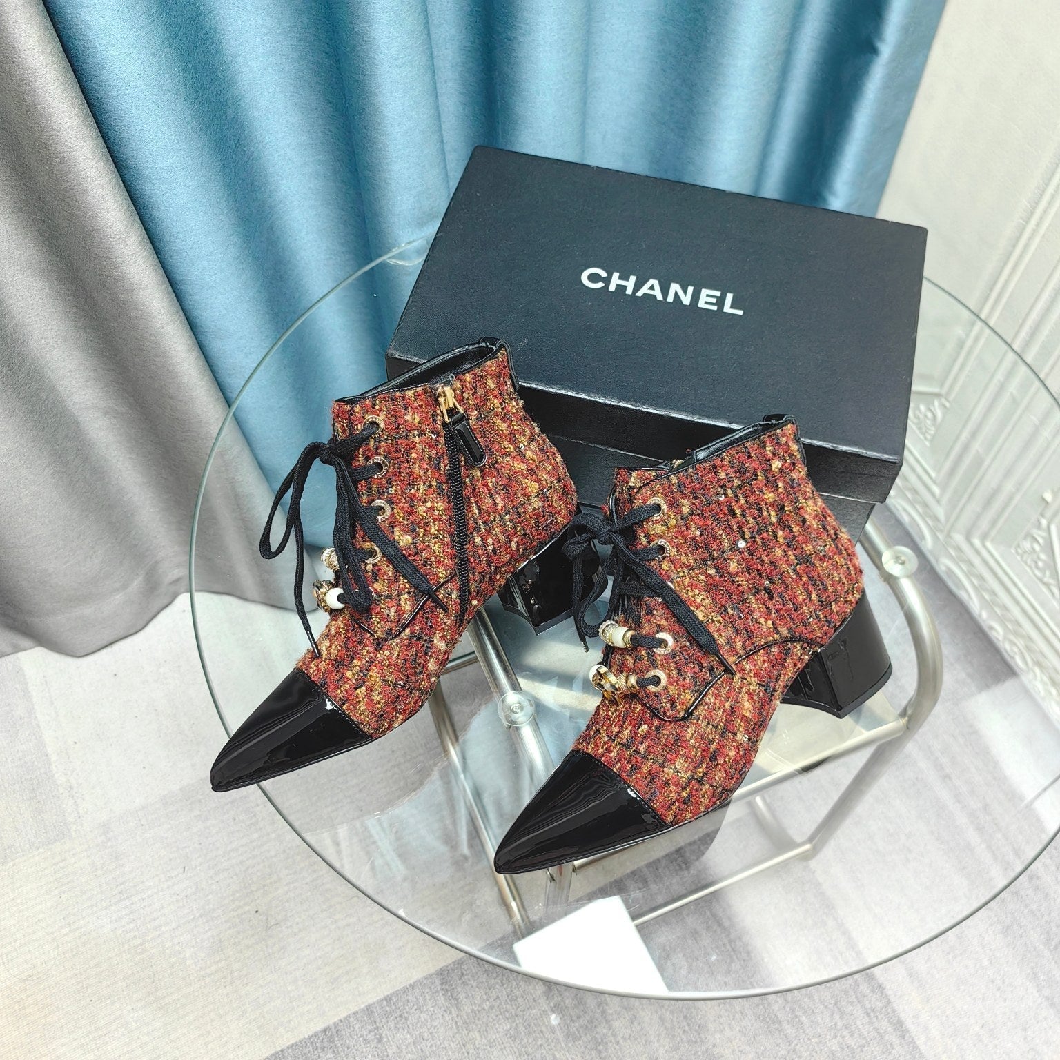 CC Ankle Boots Red Orange Tweed Fabric And Lambskin