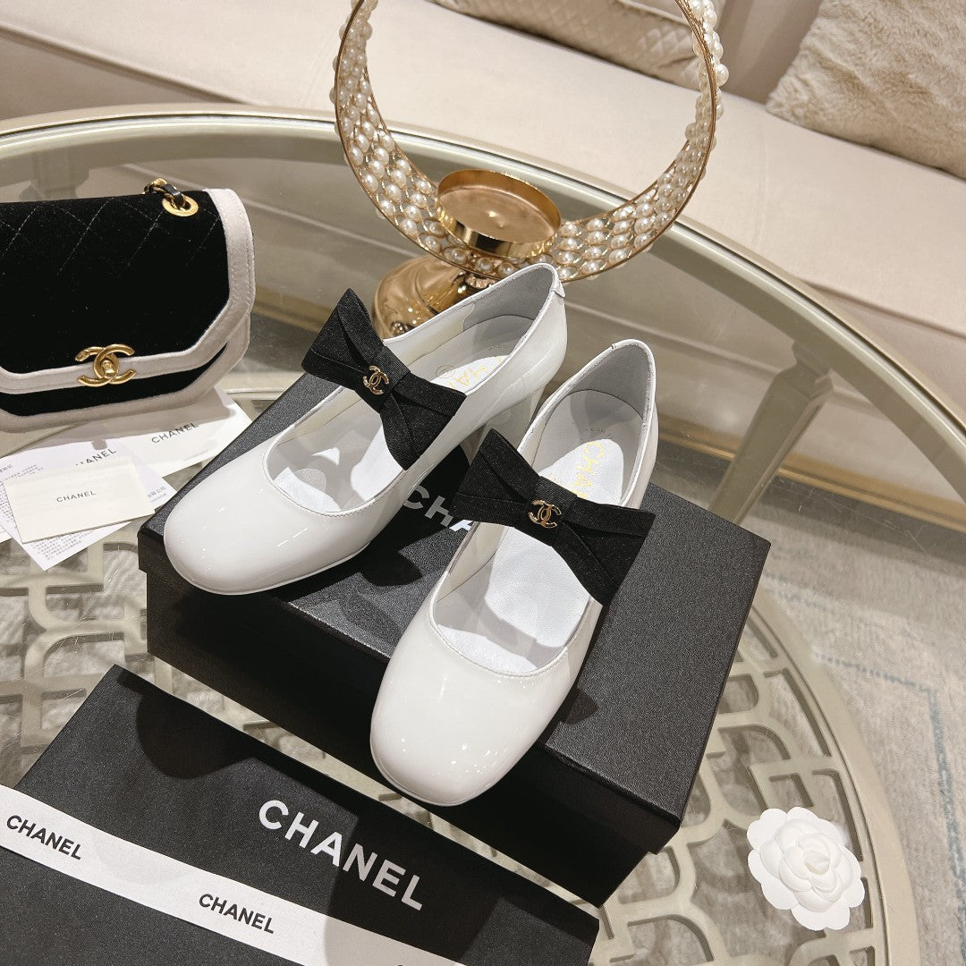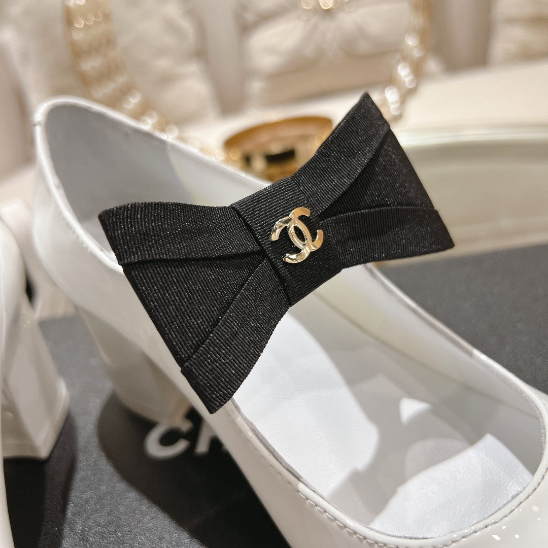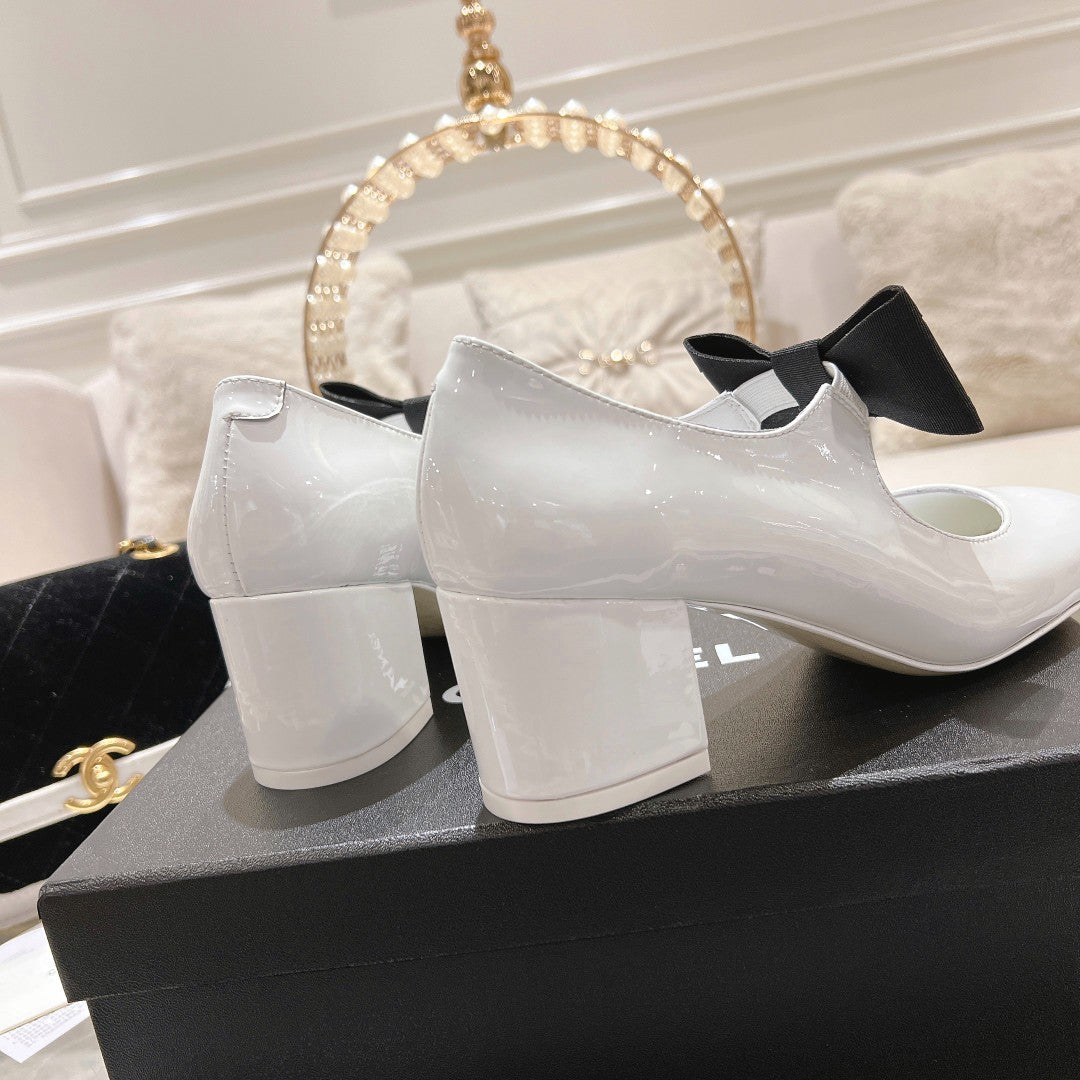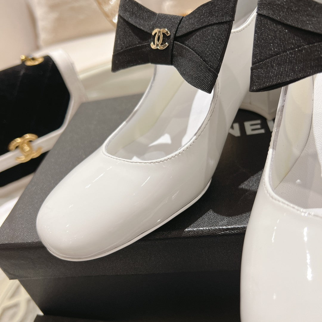 CC High Mary Janes 55mm White With Black Bow Glossy Calfskin 943288
