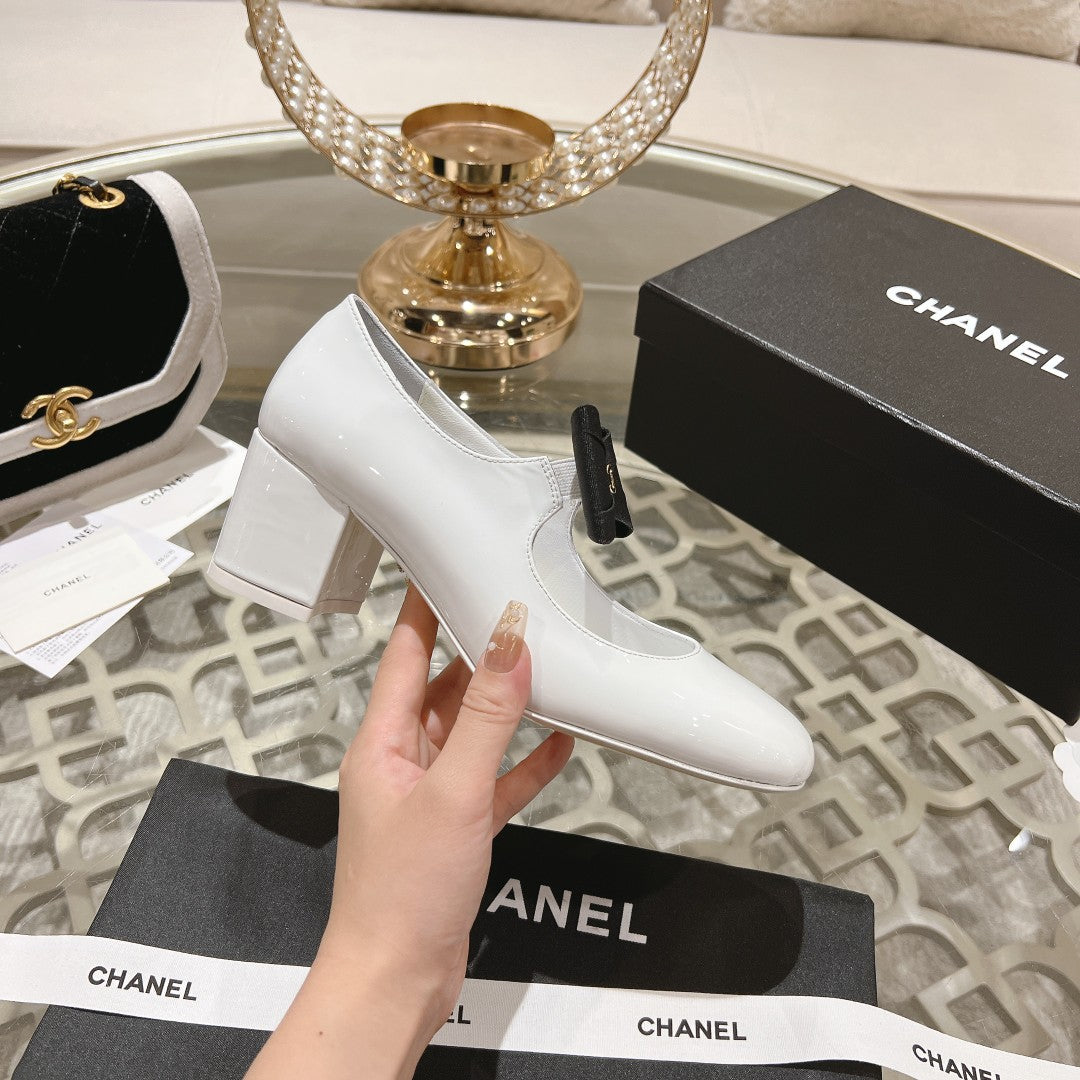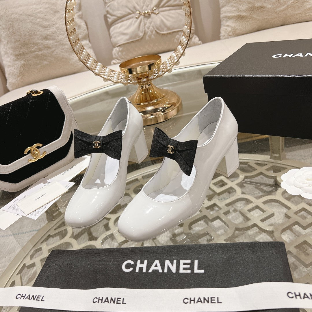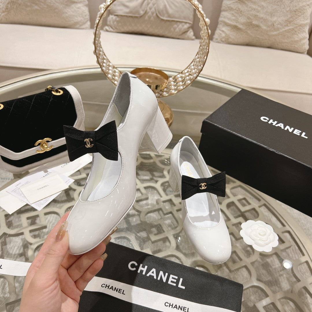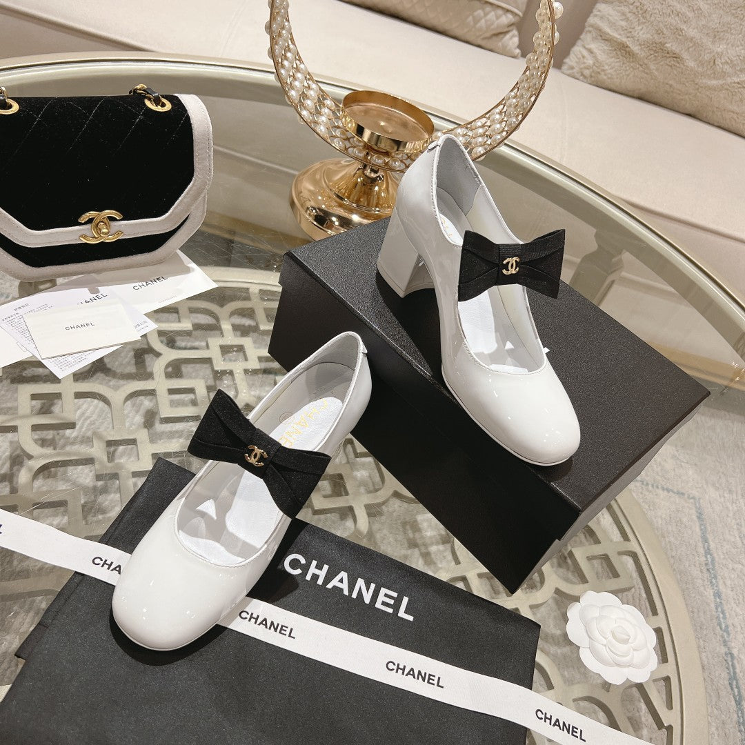 CC High Mary Janes 55mm White With Black Bow Glossy Calfskin 943288
