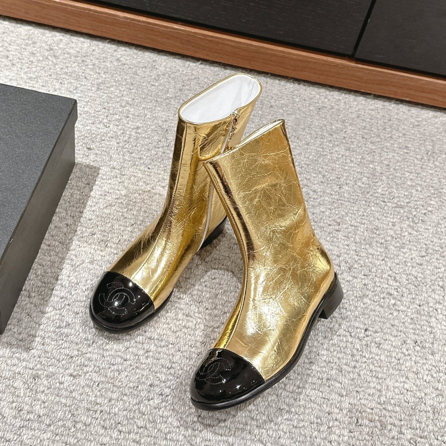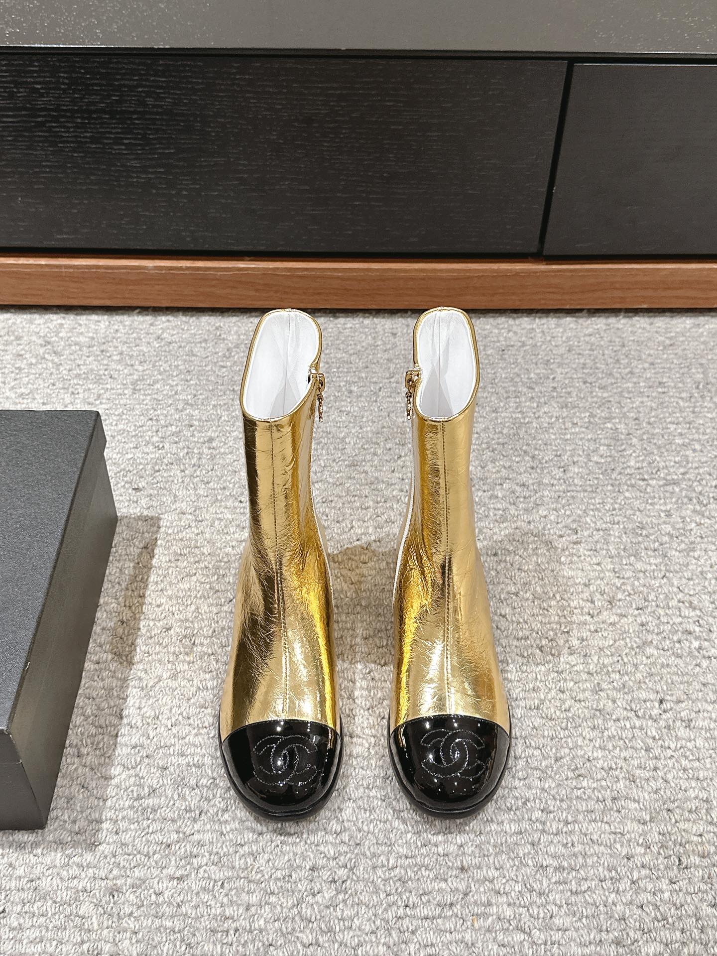 CC Short Boot Gold Metalic Lambskin Black Patent Calfskin