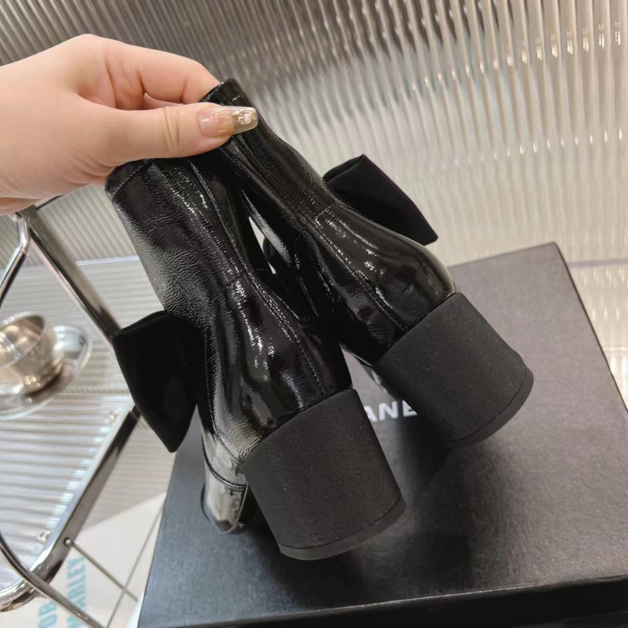 CC Short Boots 60mm Glossy Black Camellia Cowhide