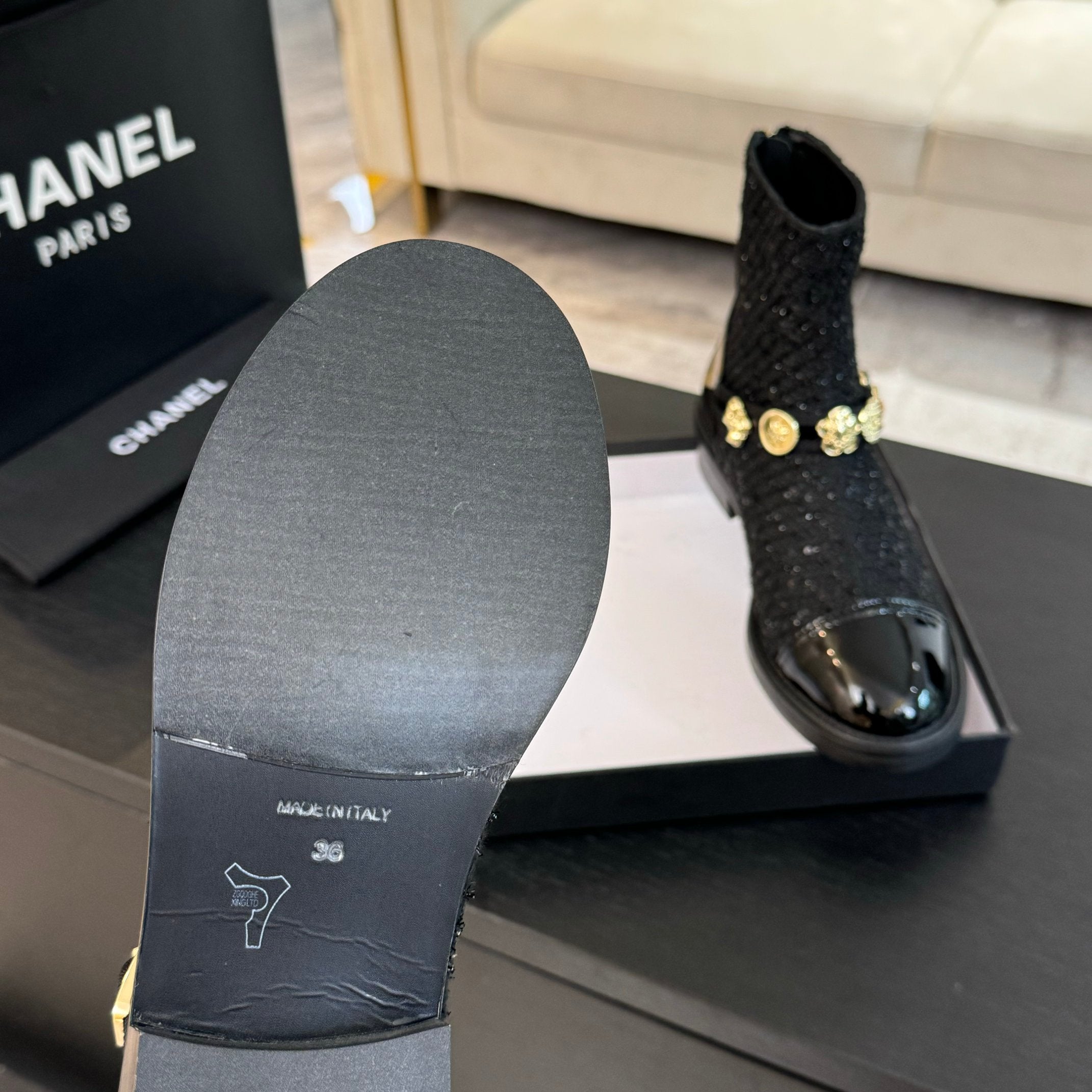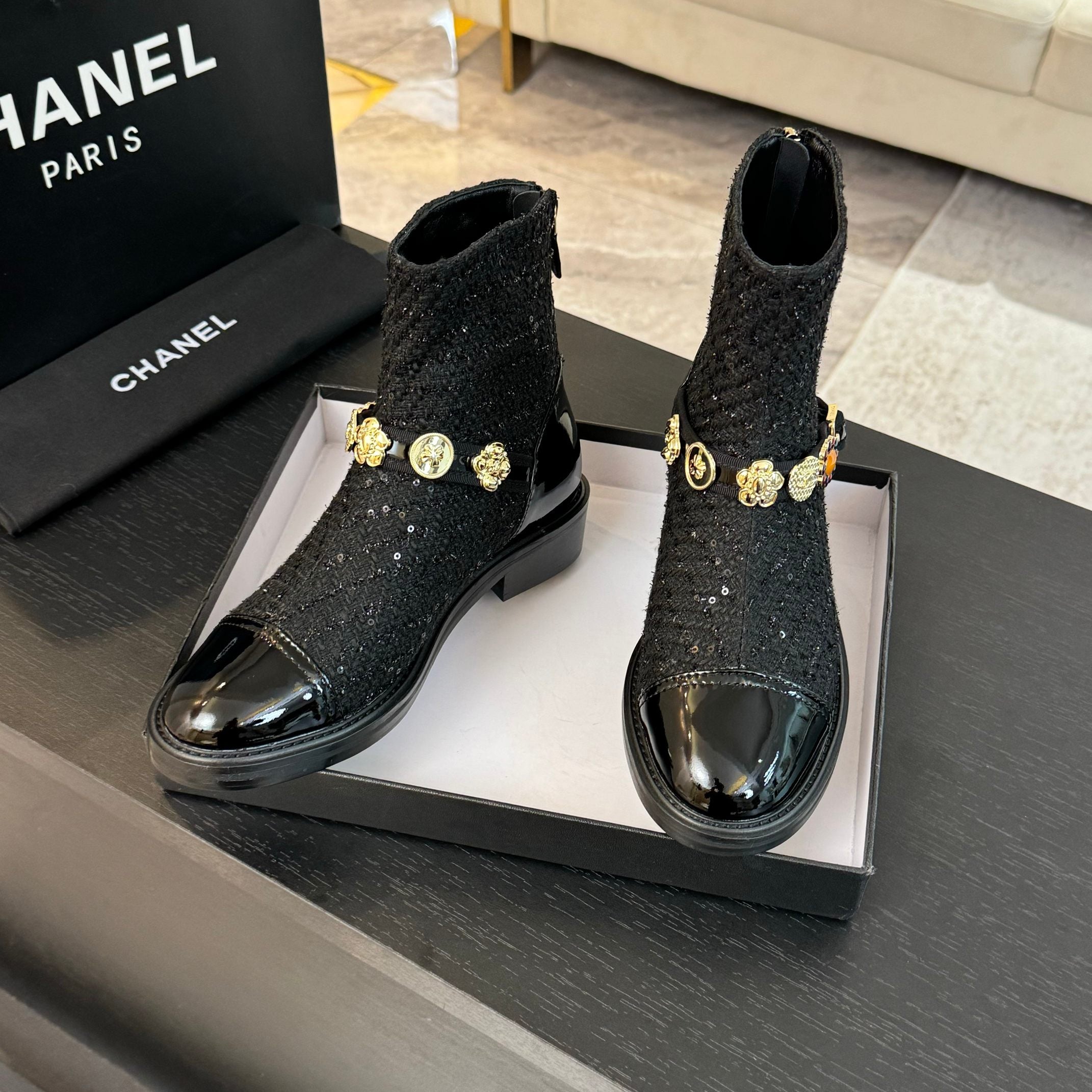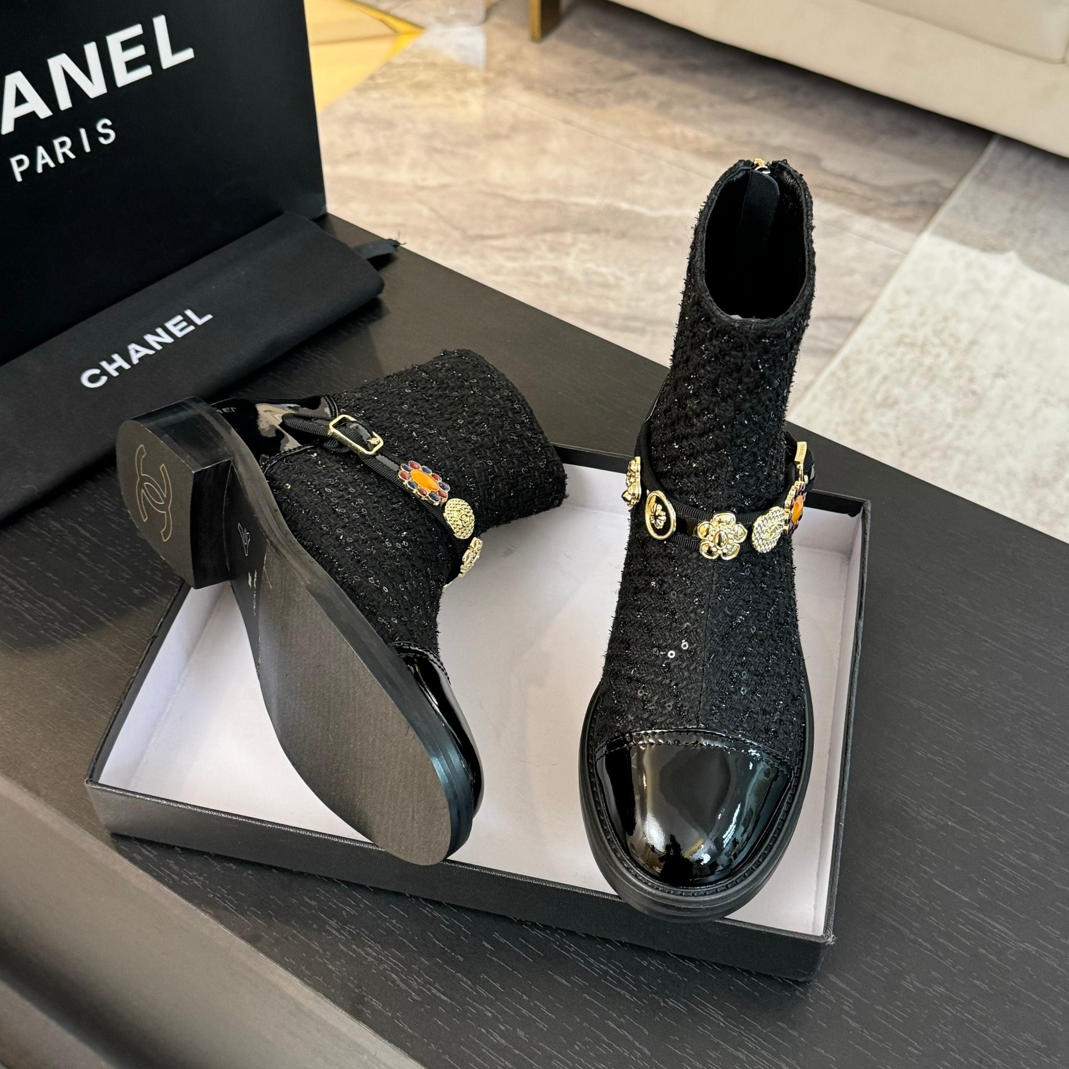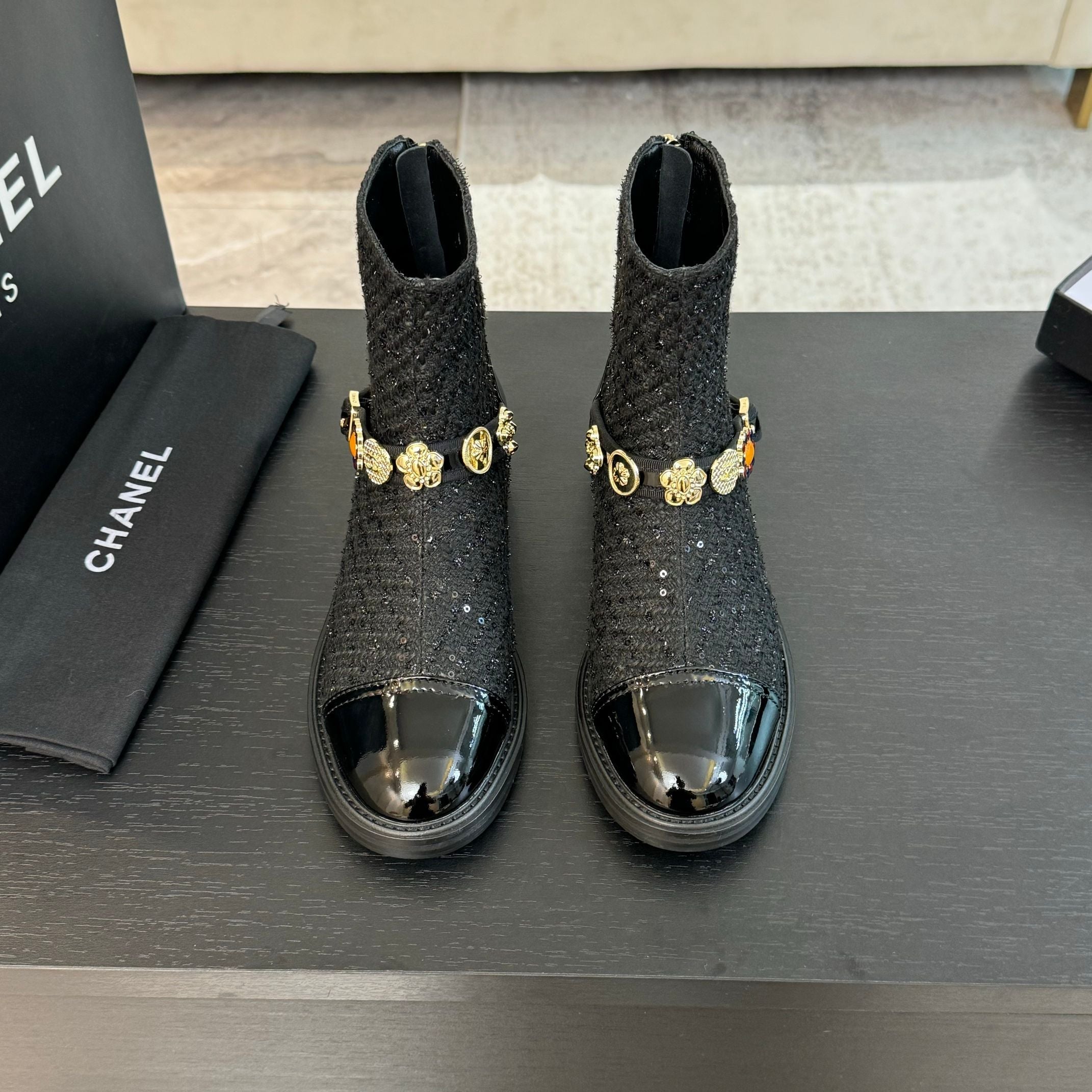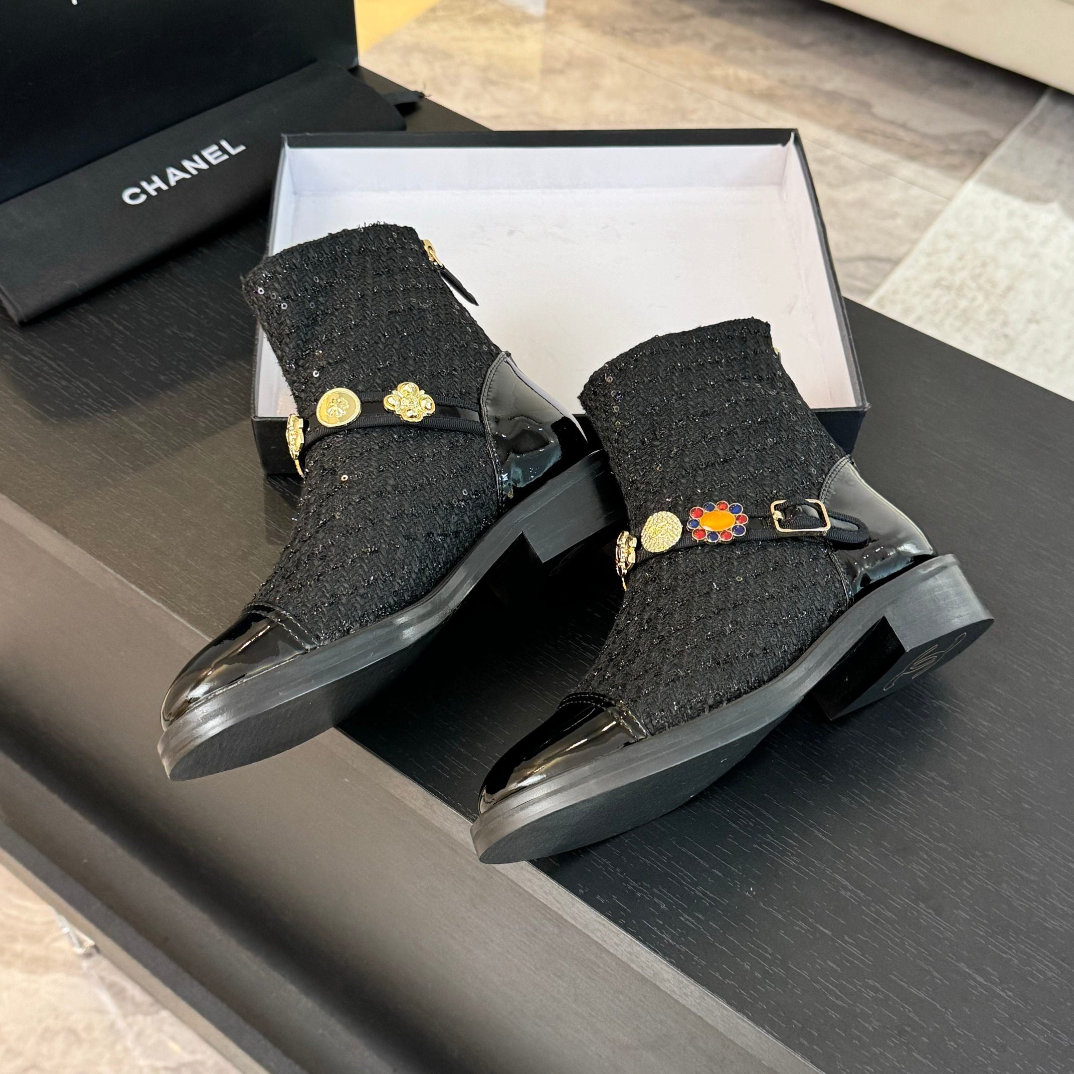 CC Short boots Black Cowhide Mix Tweed Fabric