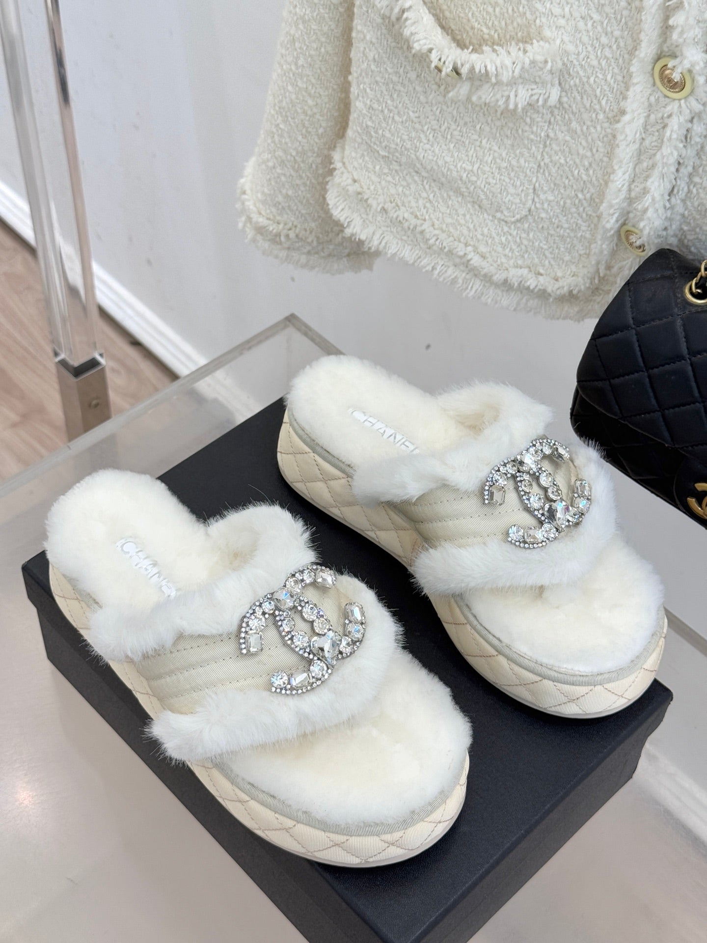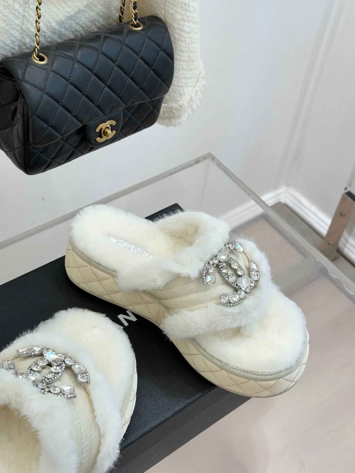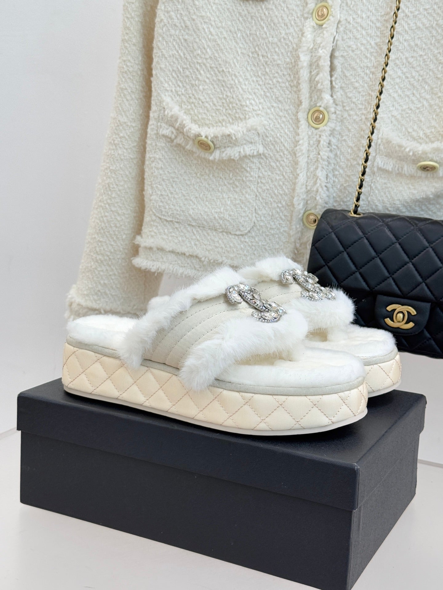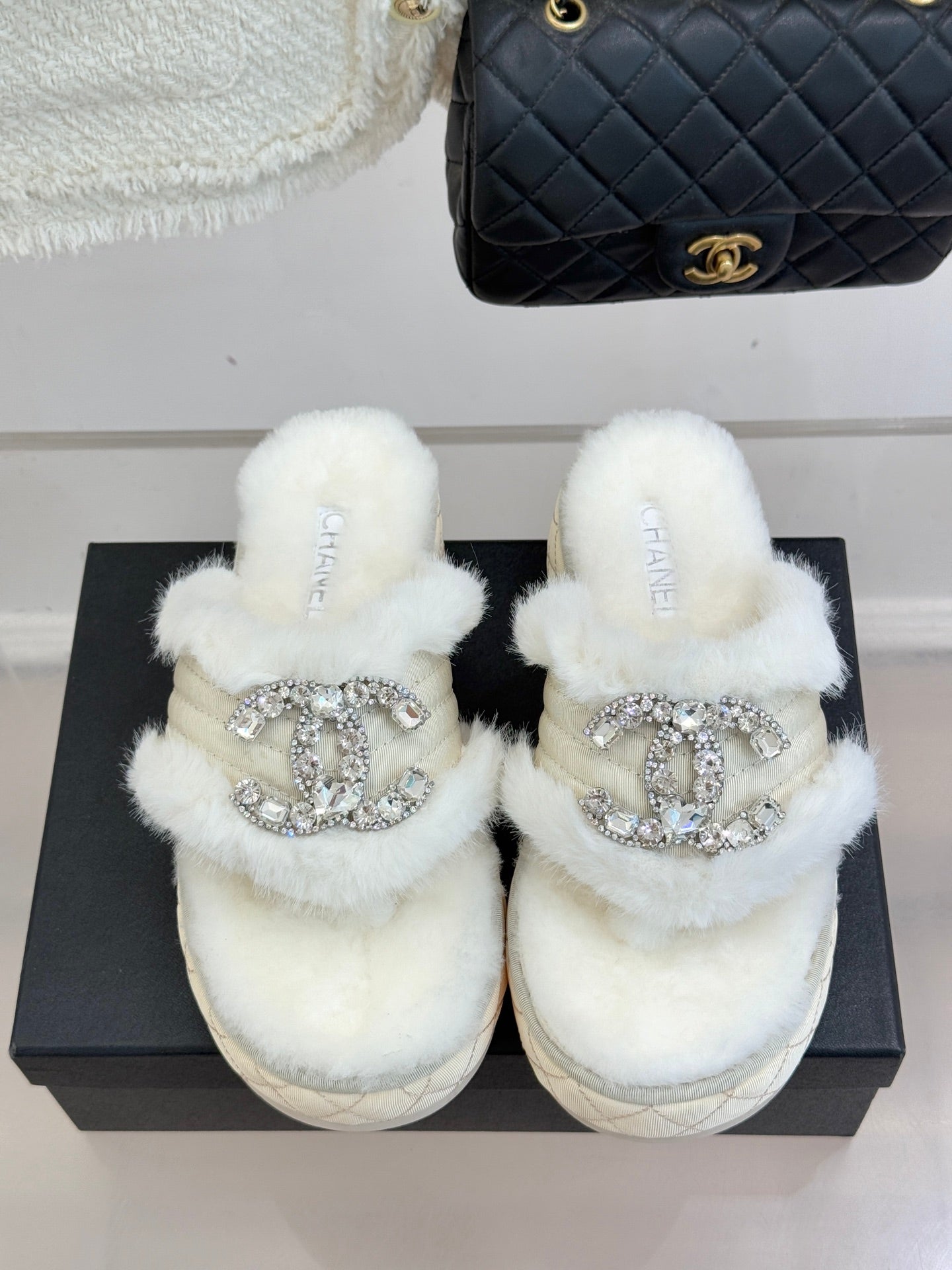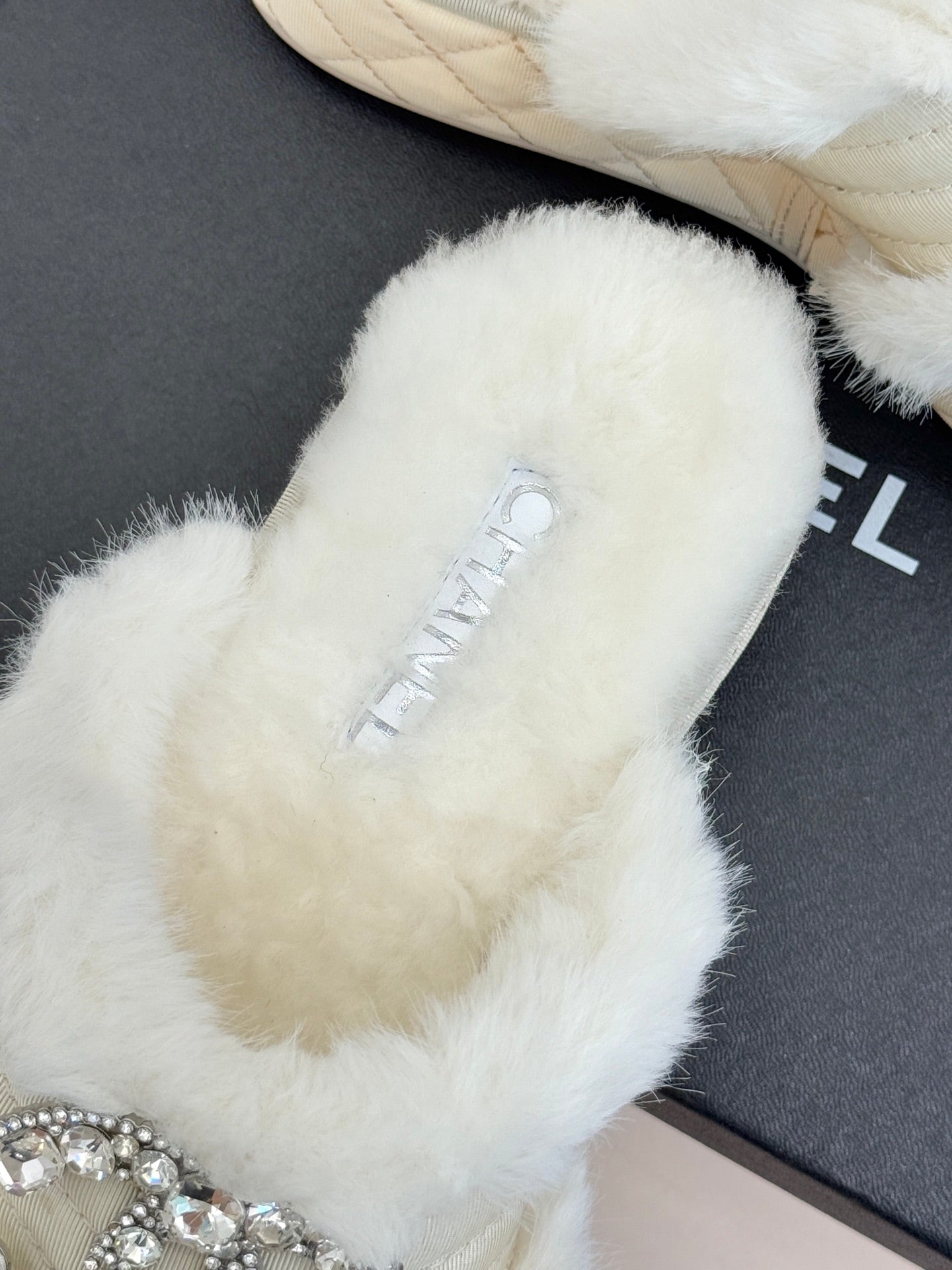 CC slipper double C rhinestone buckle white wool 512052