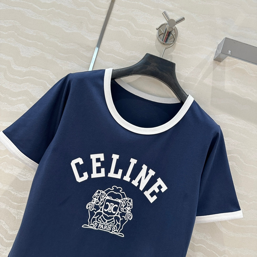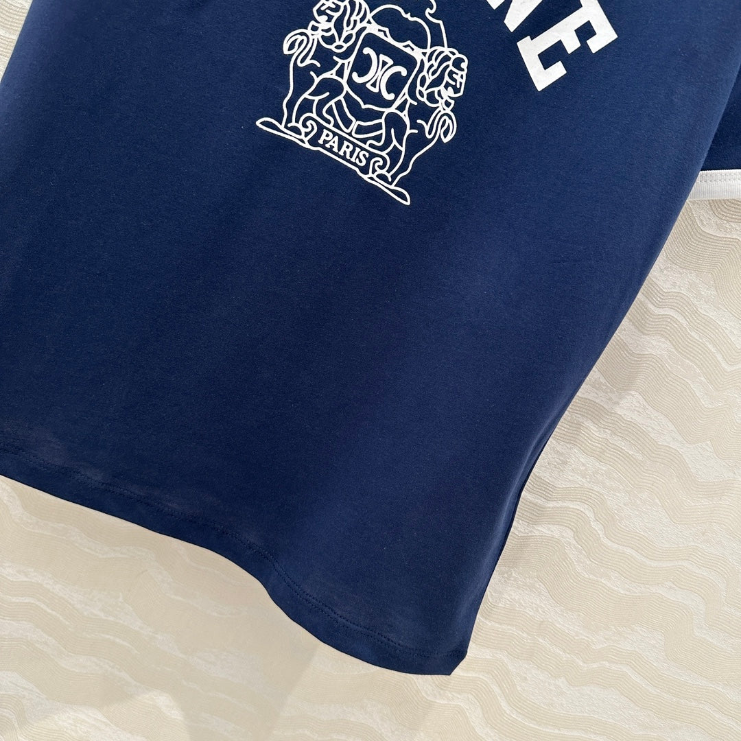 Celine 25 Arc de Triomphe Letter Short Sleeve T-shirt Navy Blue mix White Cotton