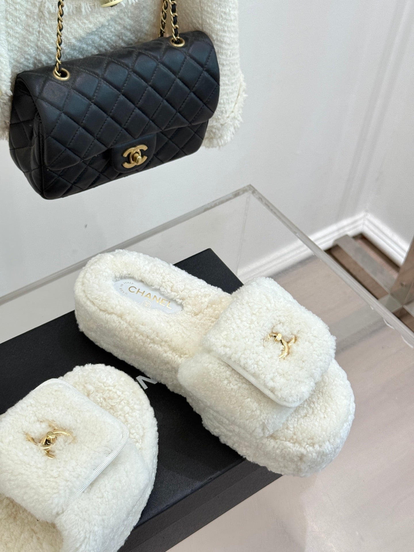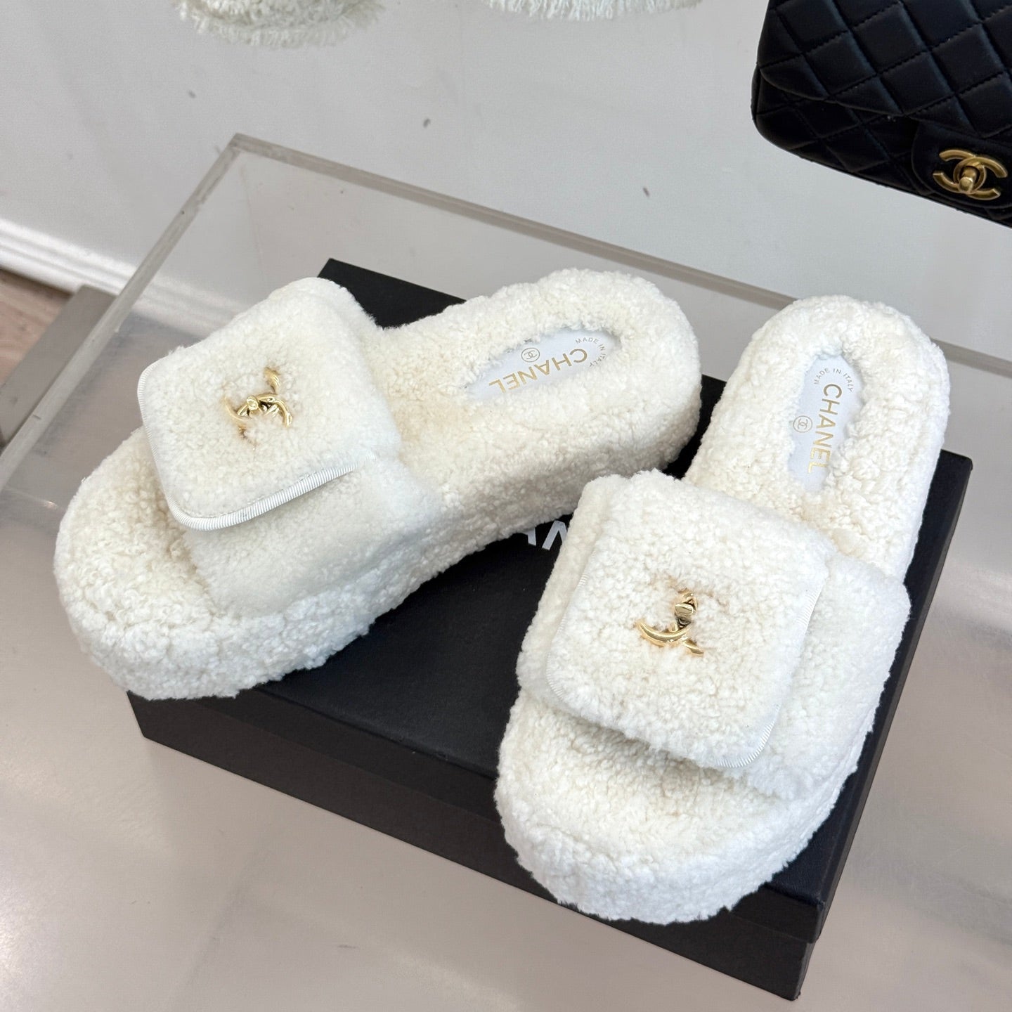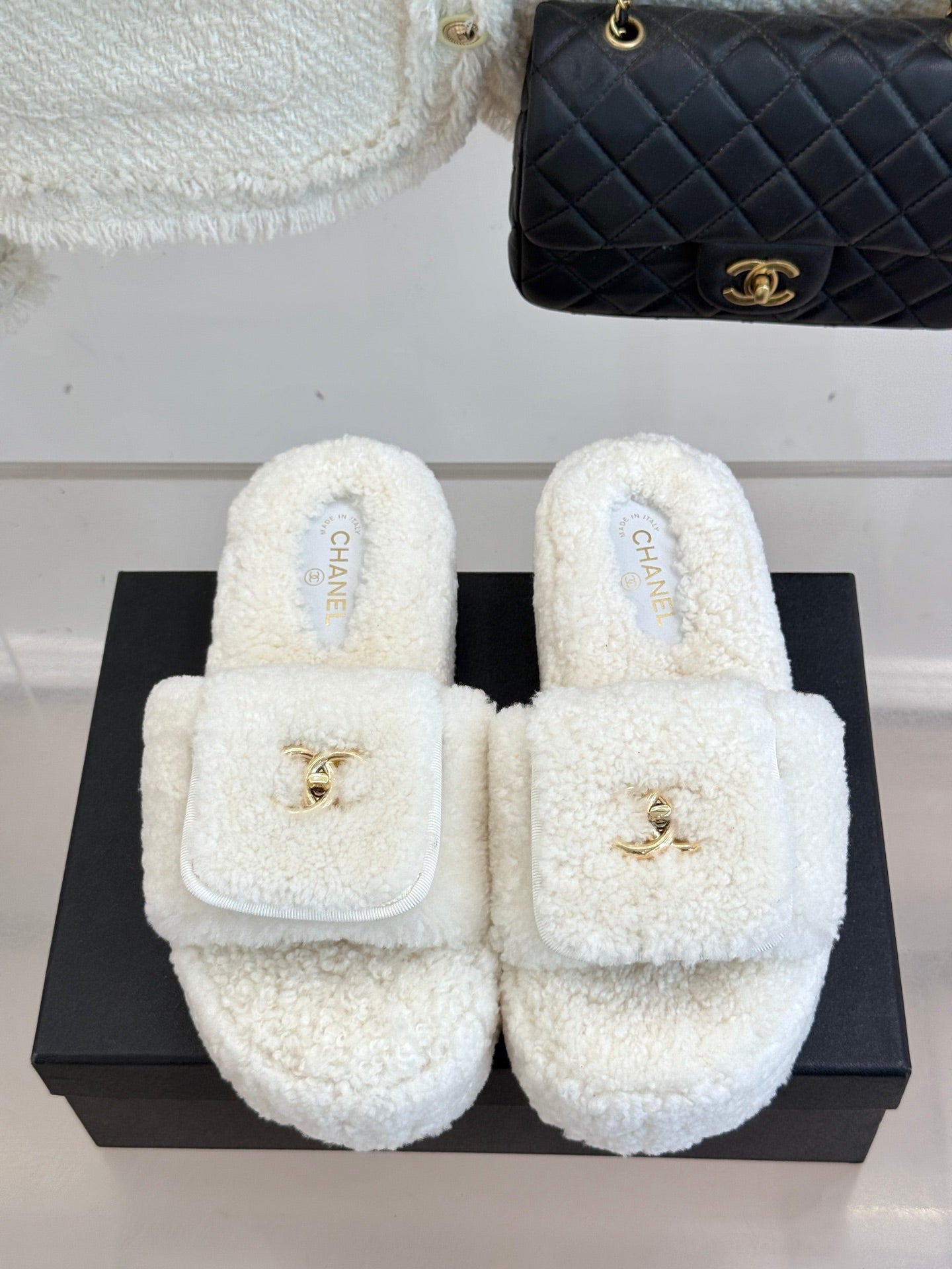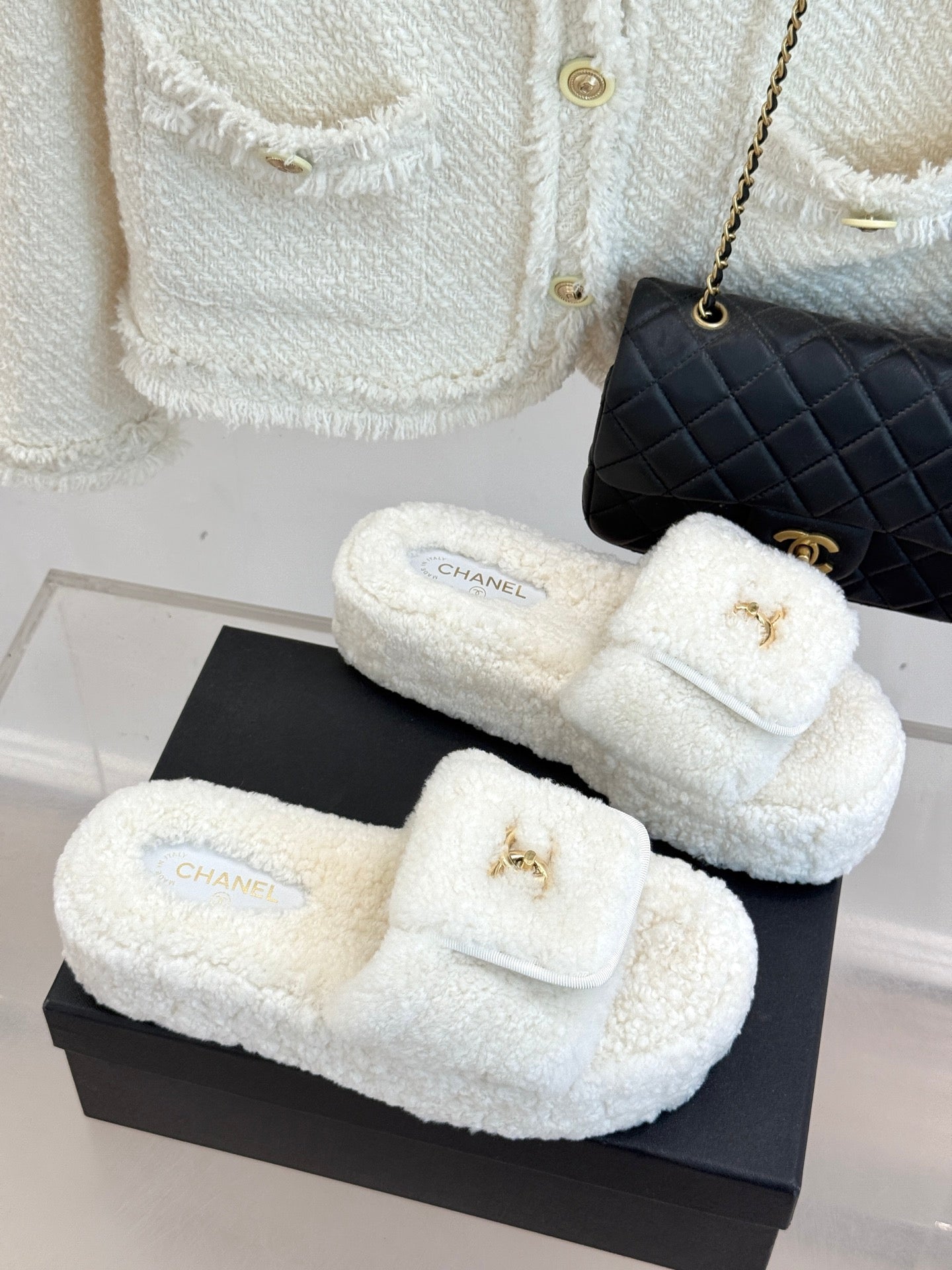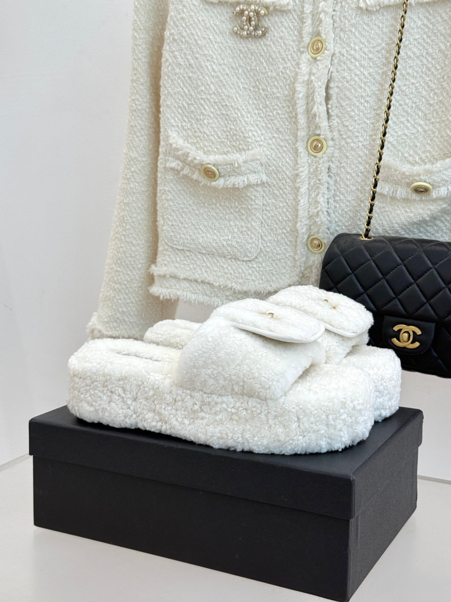 Chanel 25 Buckle Flip-up Thick-soled Slippers White Wool 465387