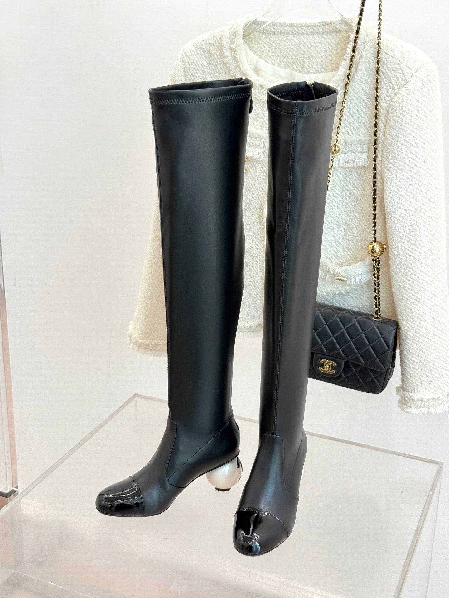 Chanel 25 Double C Giant Pearl Heel Long Boot Black White Sheepskin 465413
