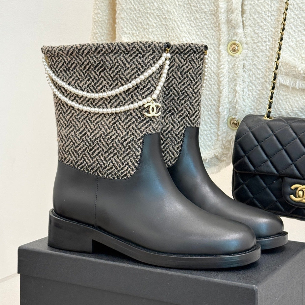 Chanel 25 Four-Leaf Clover Pearls Double C Boots Black Grey Woven Sheepskin 465404