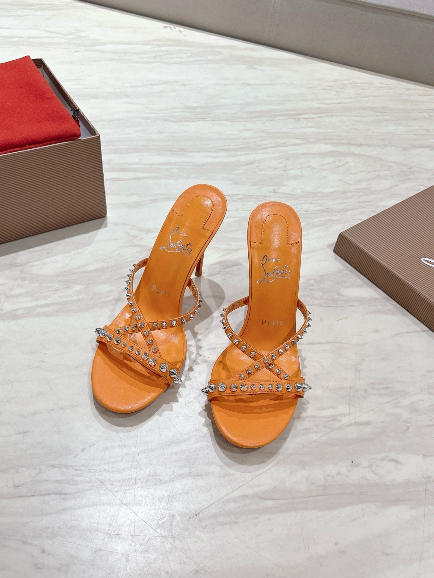 CL 25 Cross-Strap Slippers Orange Gloss Calf Patent Leather Rivets 314924
