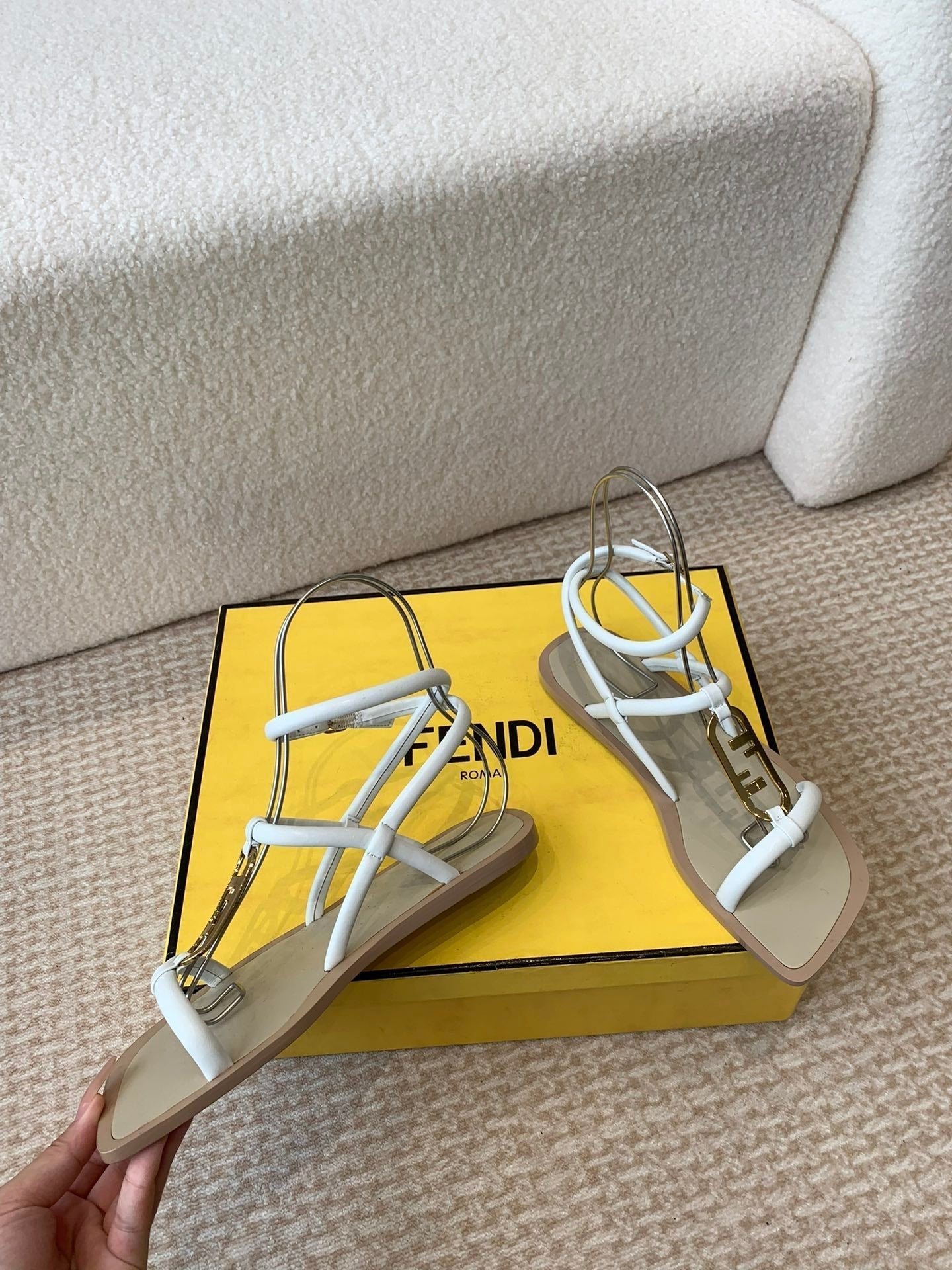 FENDI O'LOCK THONG SANDAL WHITE CALFSKIN WITH GOLD HARDWARE