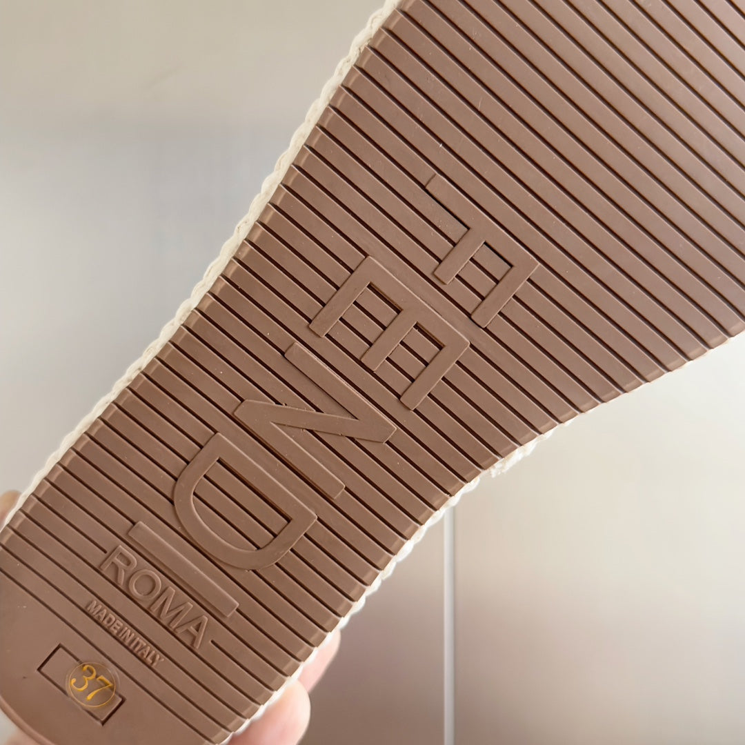 FENDI PLATFORM WEDGES IN WHITE RAFFIA WITH BROWN EMBROIDERED LOGO