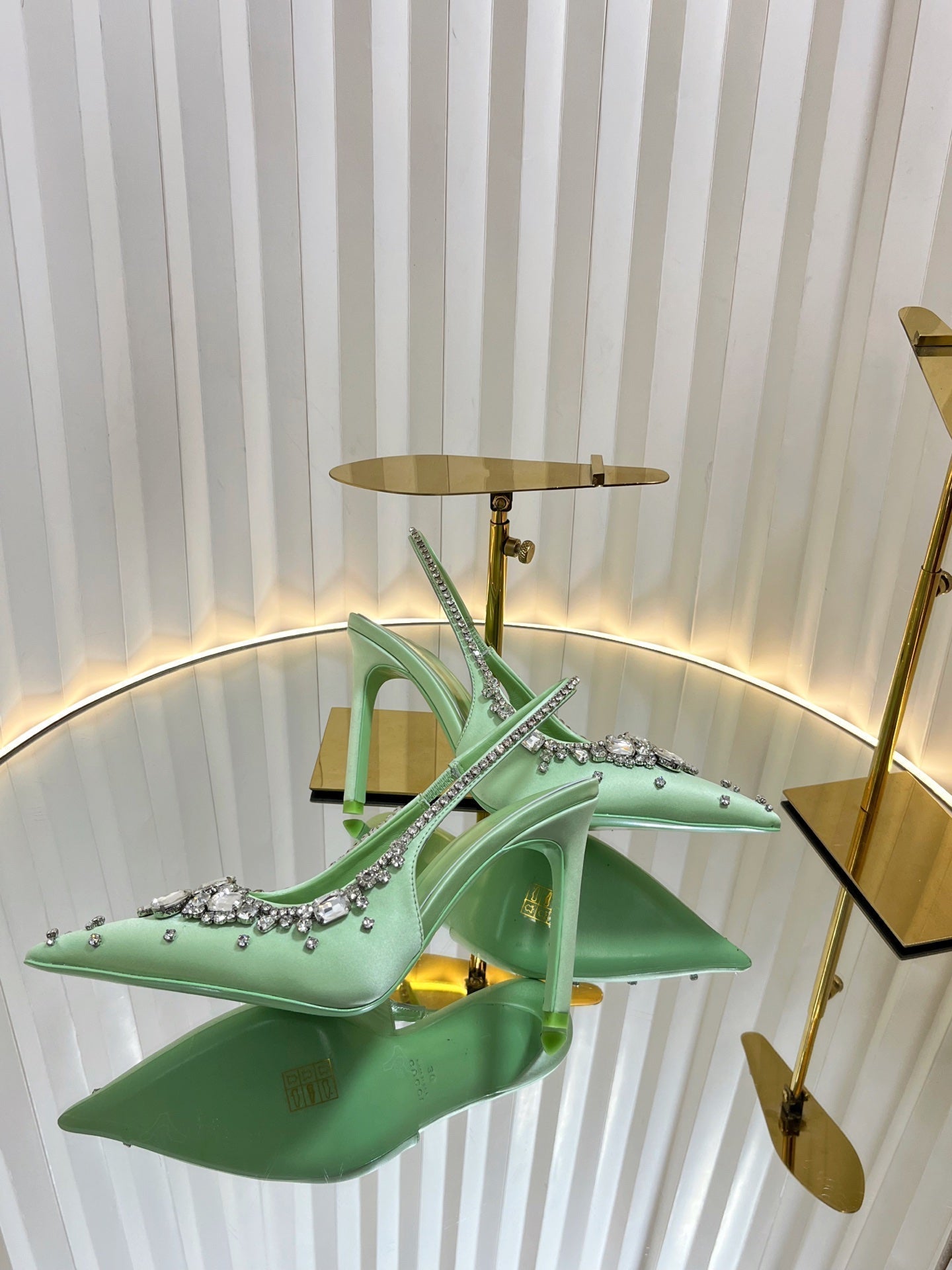 GC 2025 Crystal Embellished High Heels Slingbacks Green Silk Sheepskin 294525