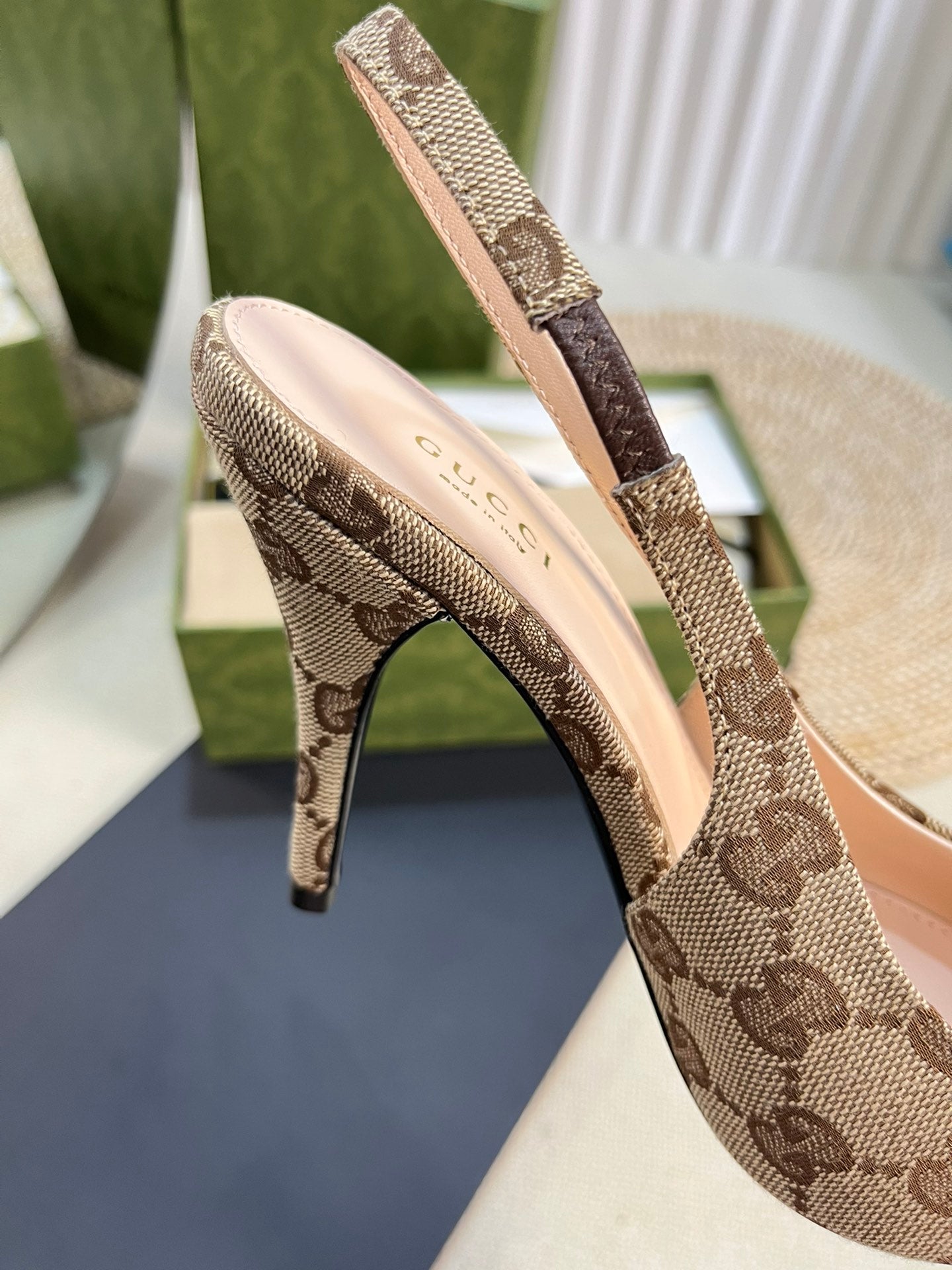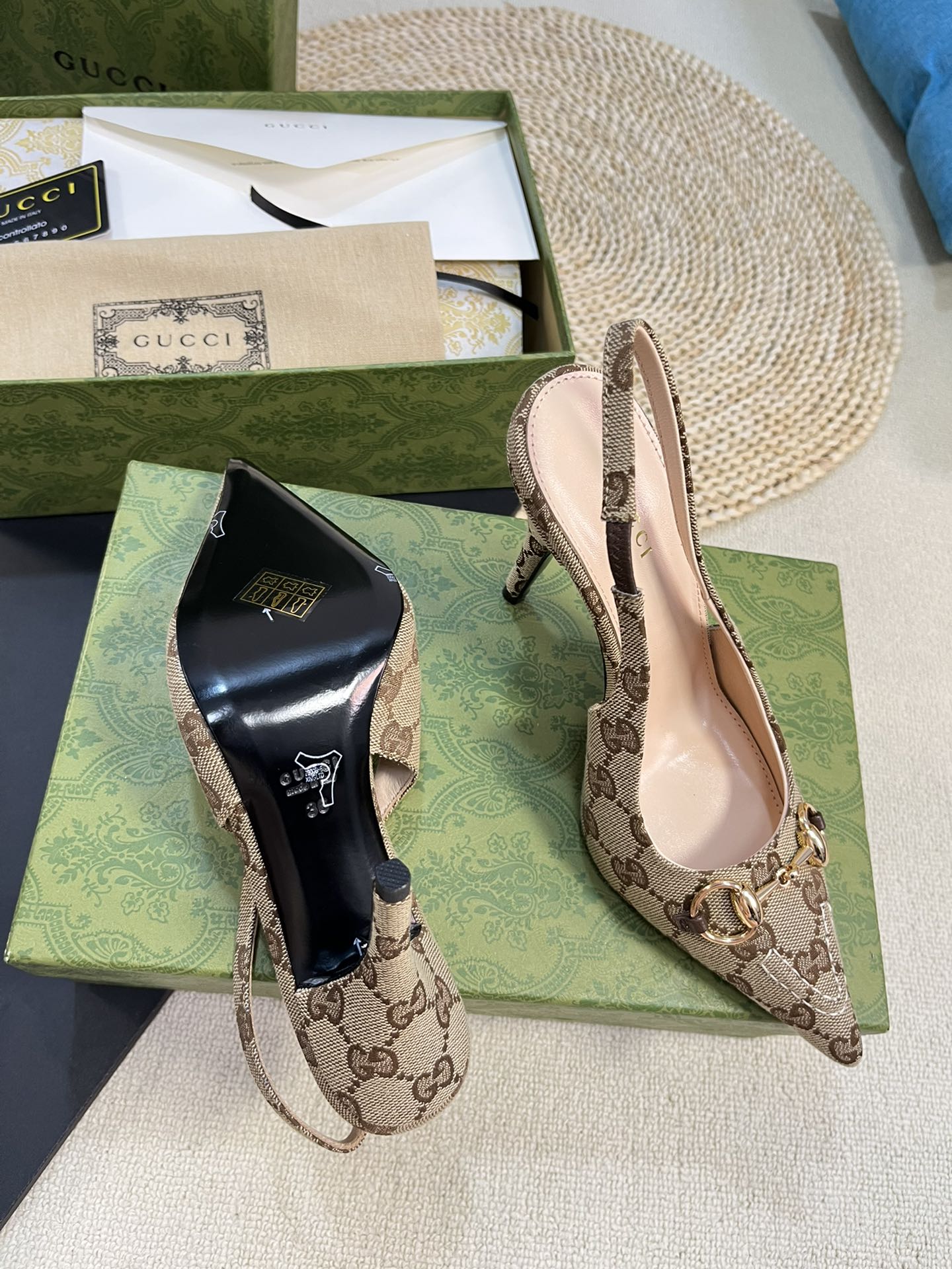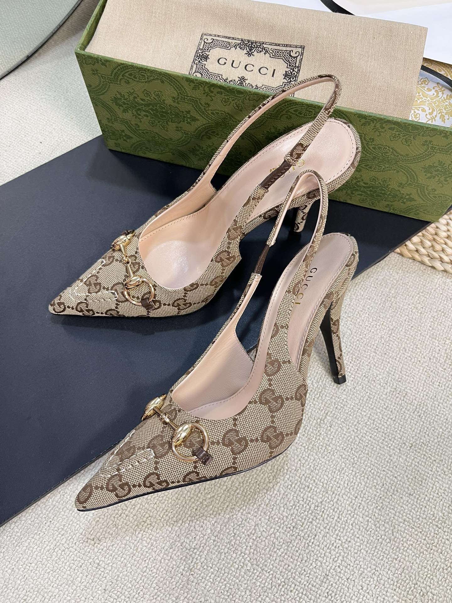 GC Horsebit Slingback Pump 100mm Beige mix Brown Canvas Sheepskin 294566