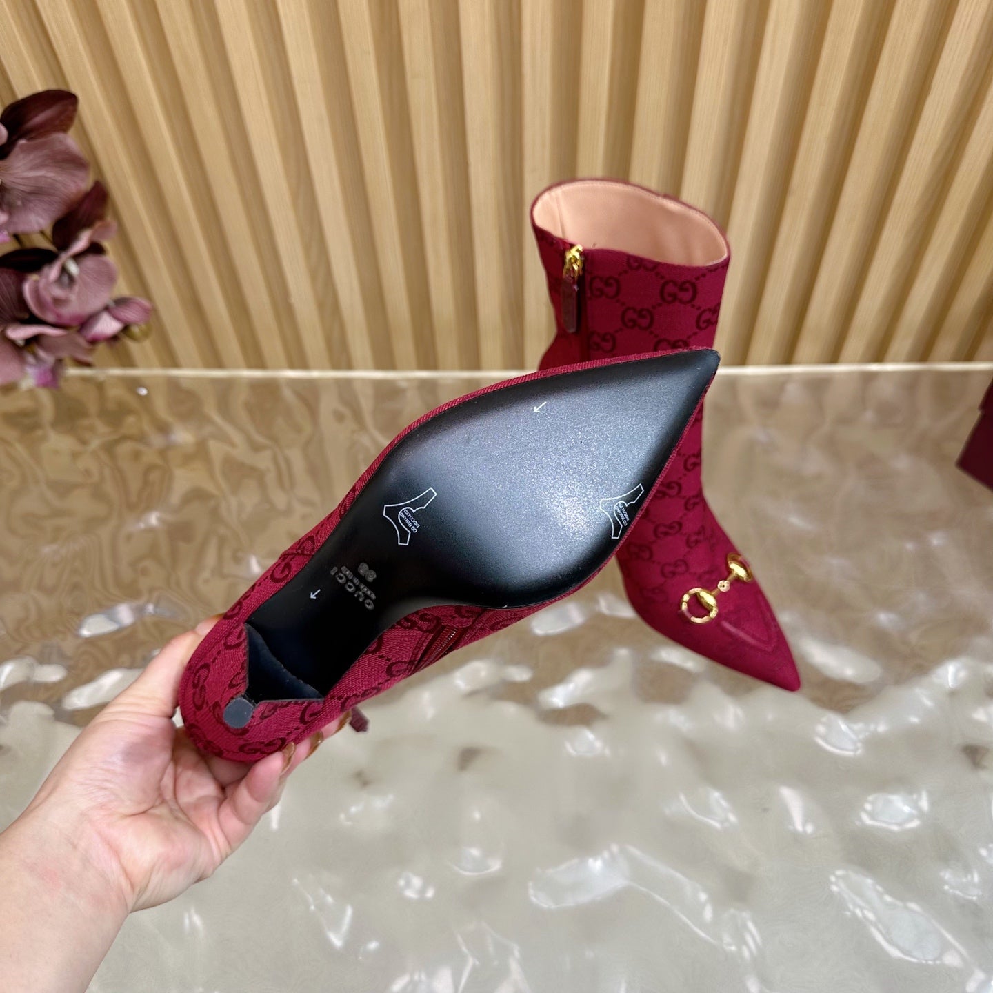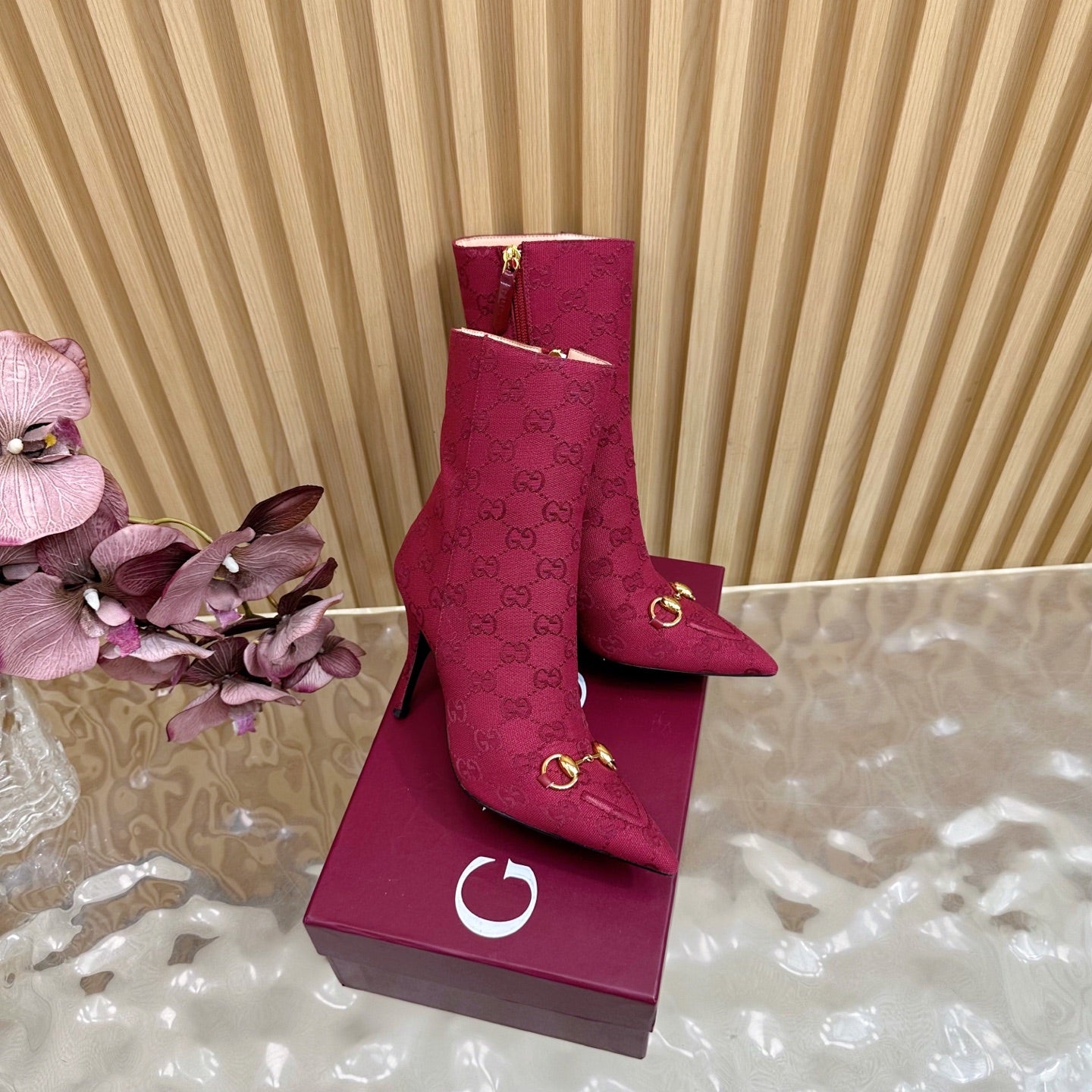 Gucci 2025 Thick-heeled Square-toed Ankle Boots Red Gold Sheepskin Fabric 498066