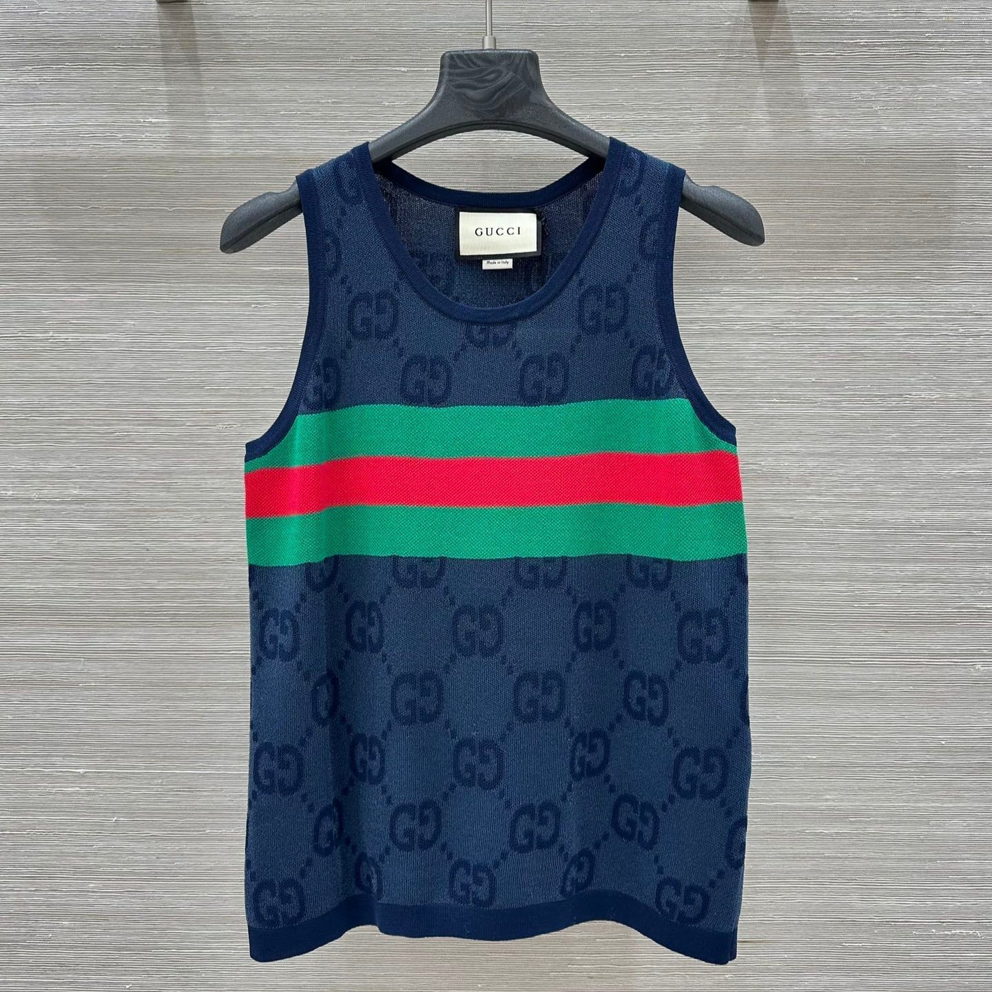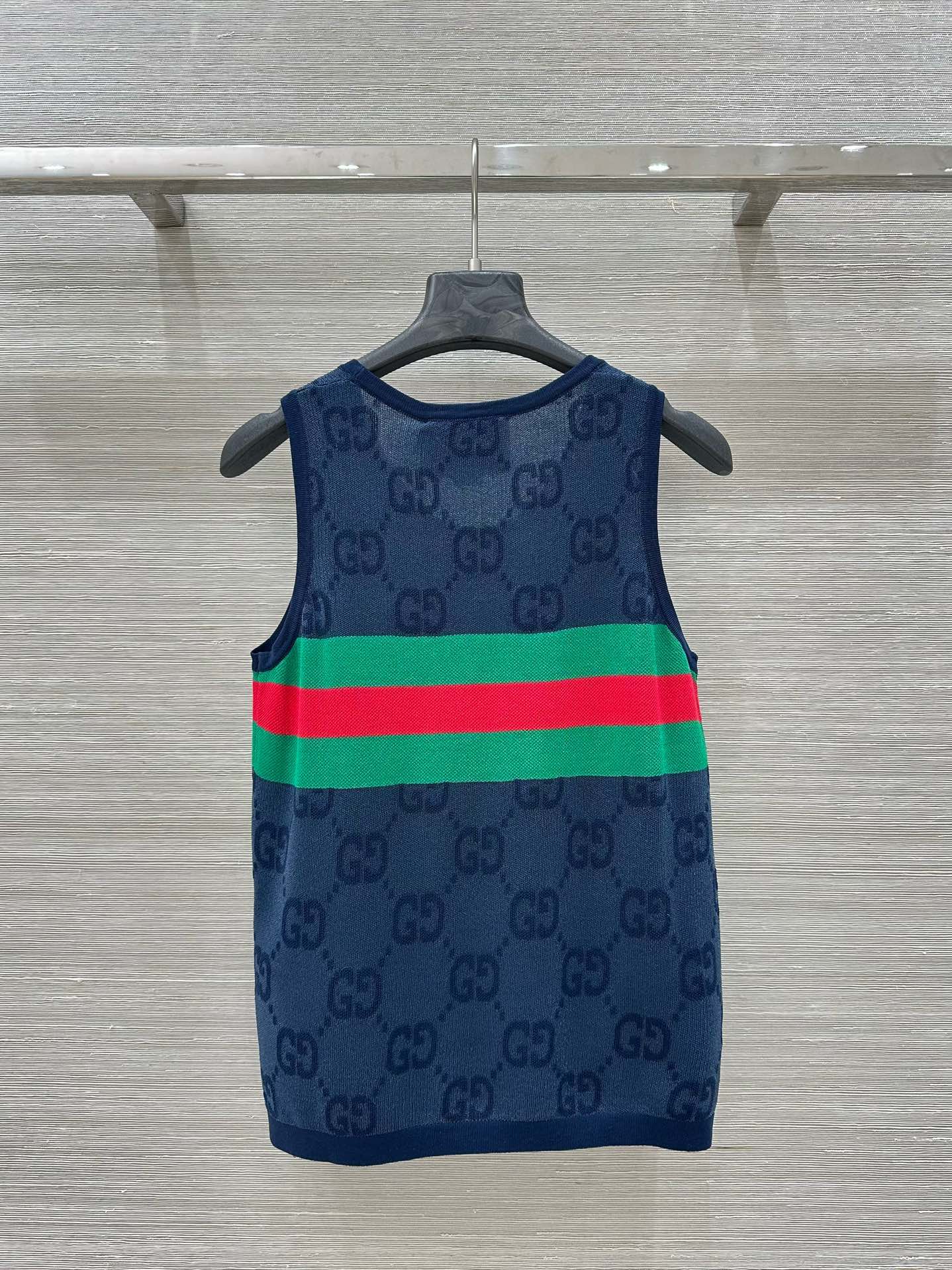 Gucci 25 Embroidered Jacquard Mesh Vest Top Navy Blue Tencel
