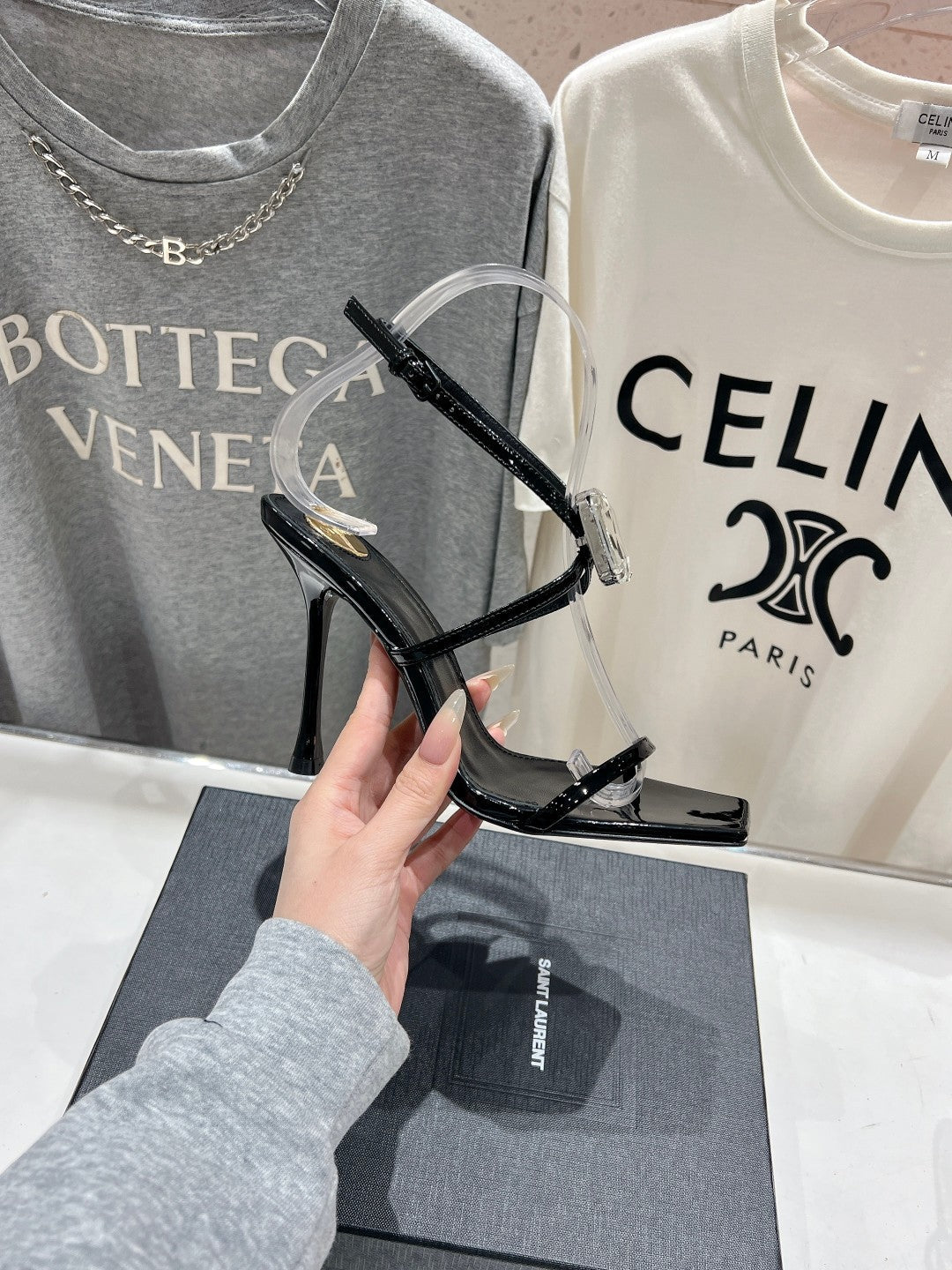 HIGH HEEL SANDALS IN BLACK GLOSSY CALFSKIN WTH STRAPS ATTACHED GEM