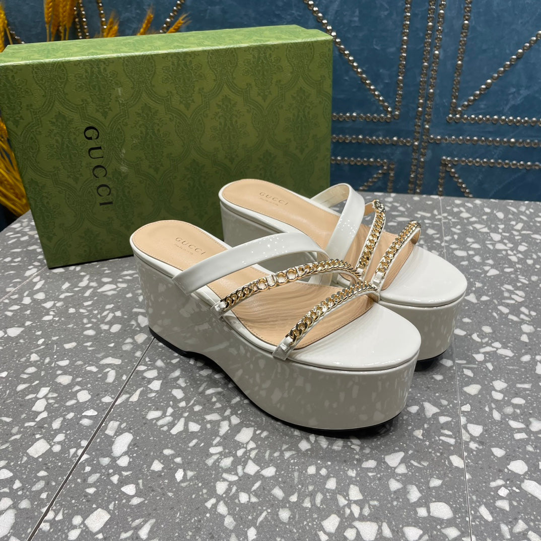 HIGH WEDGE PLATFORM IN WHITE CALFSKIN WITH GOLD HARDWARE