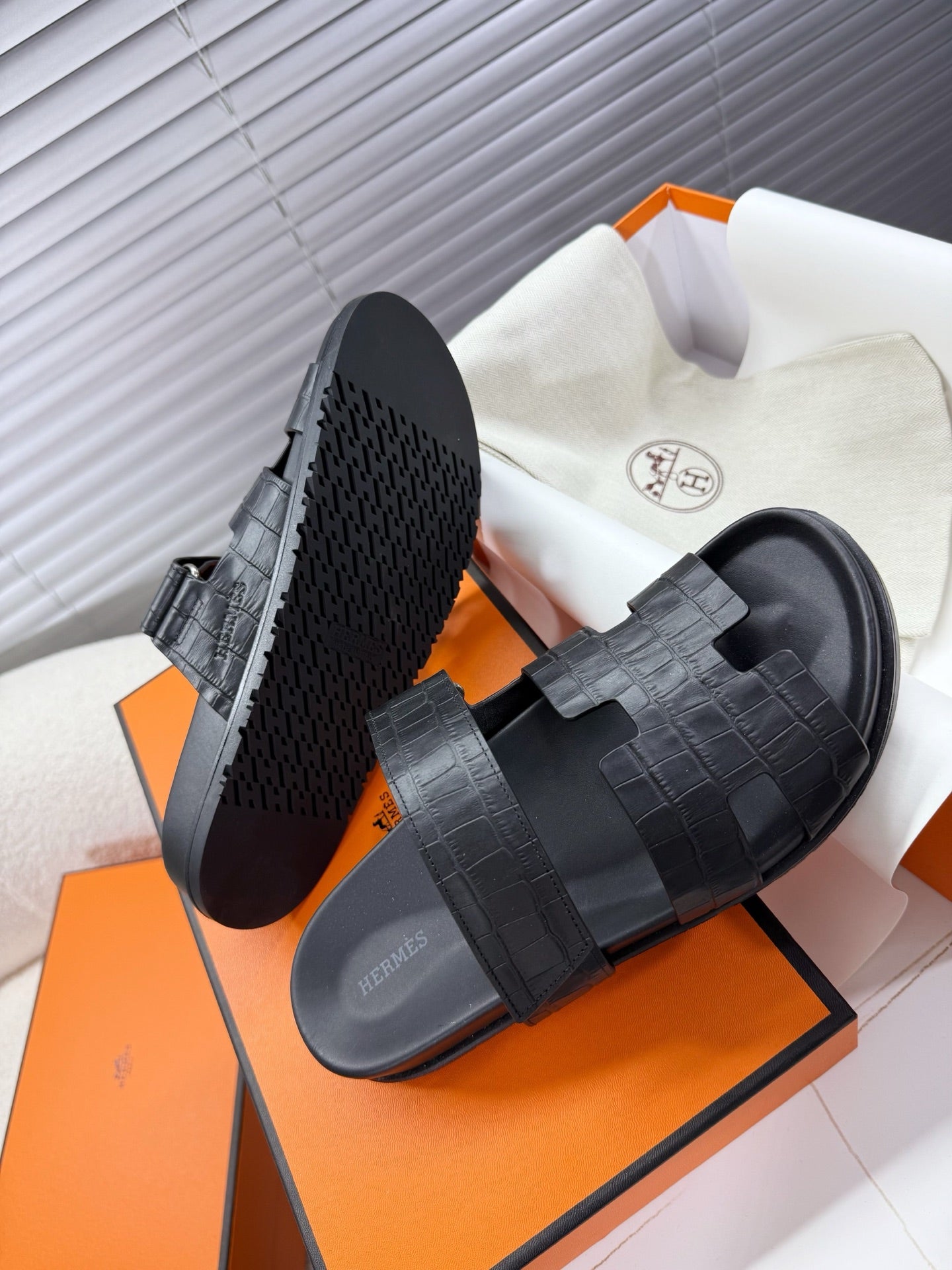 HM Chypre Sandal Black Crocodile Skin 205482
