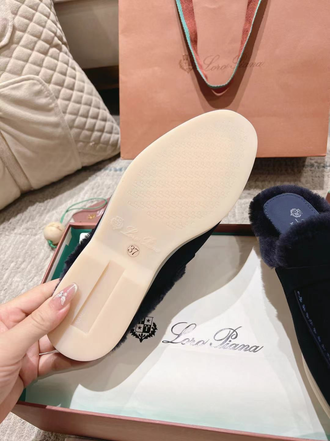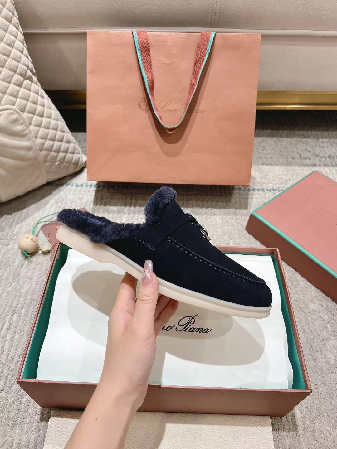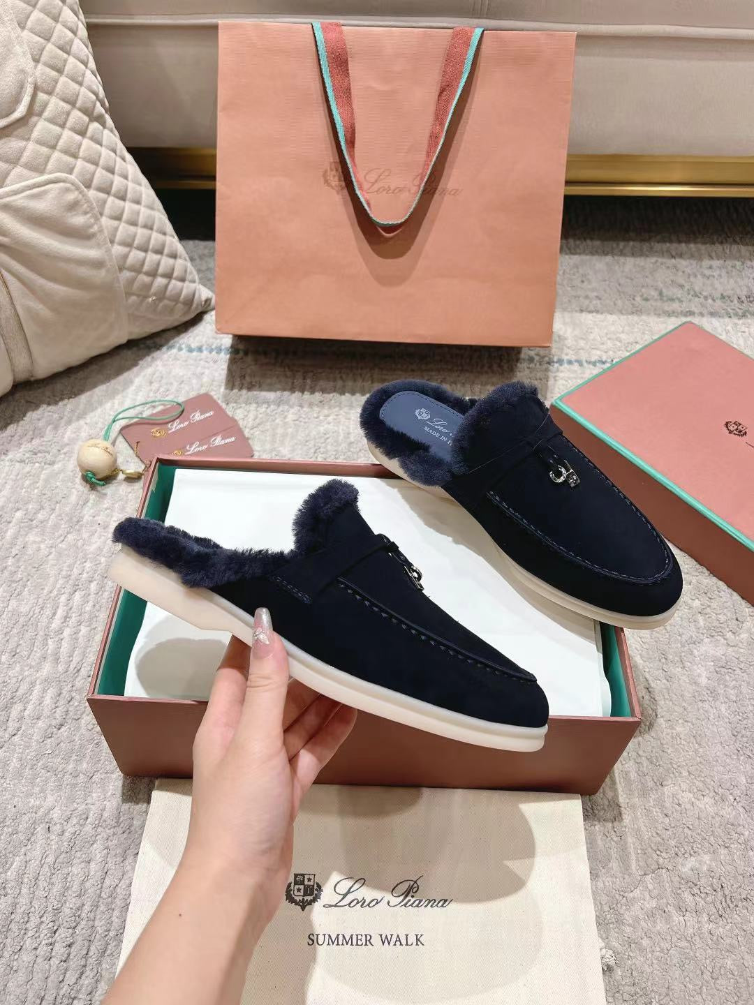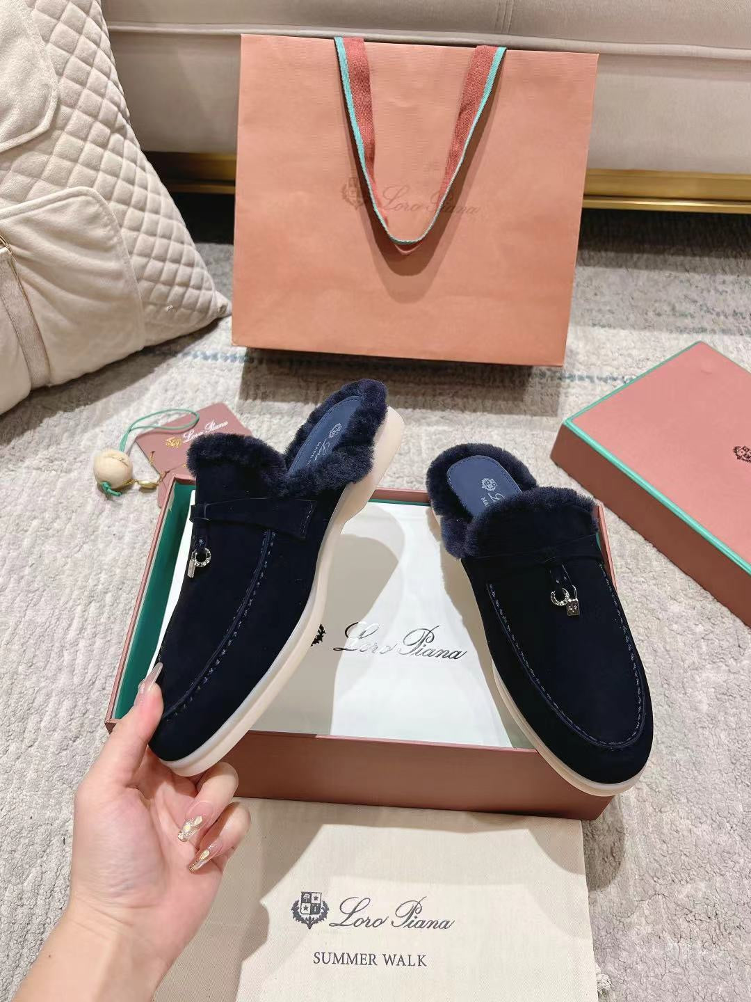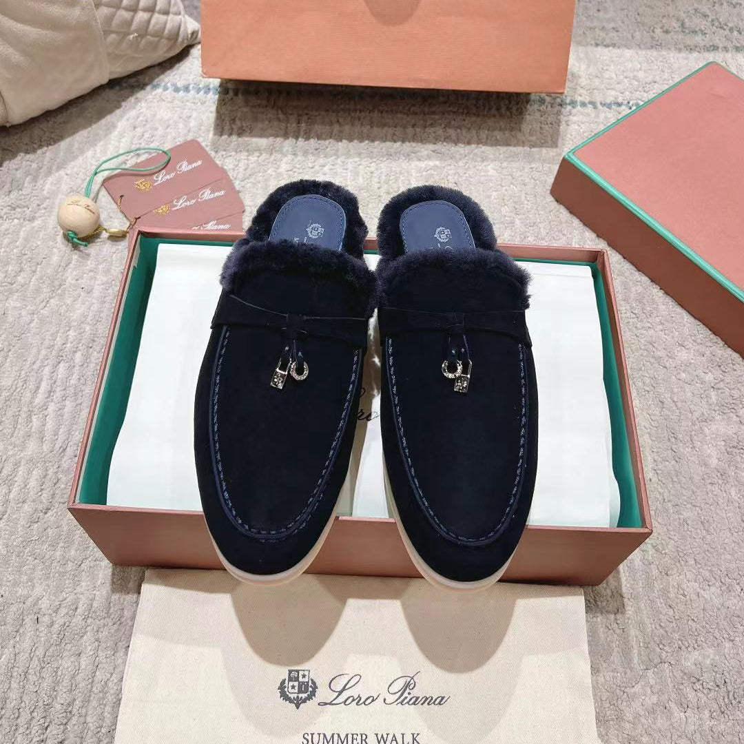 LP Charms Walk Babouche Loafer Space Blue Suede With Rabbit Fur Lining 206227