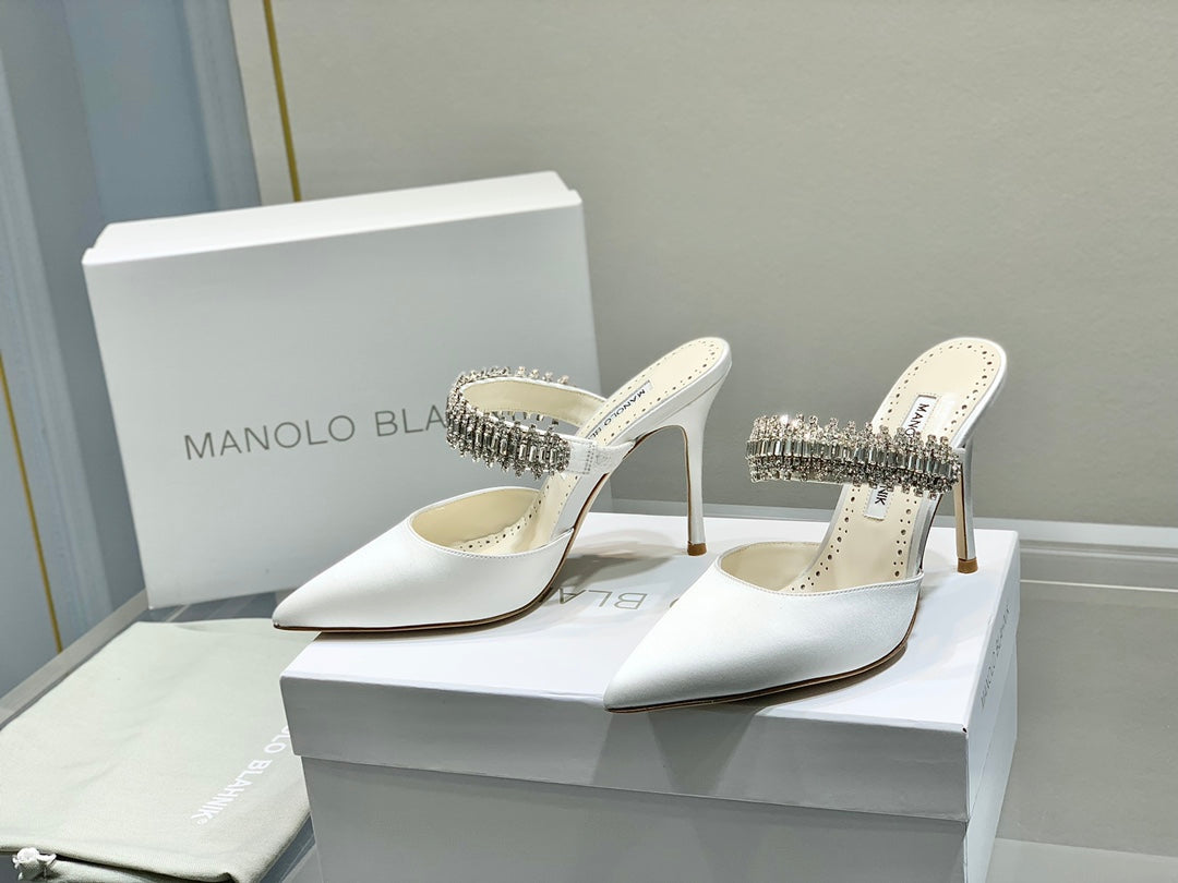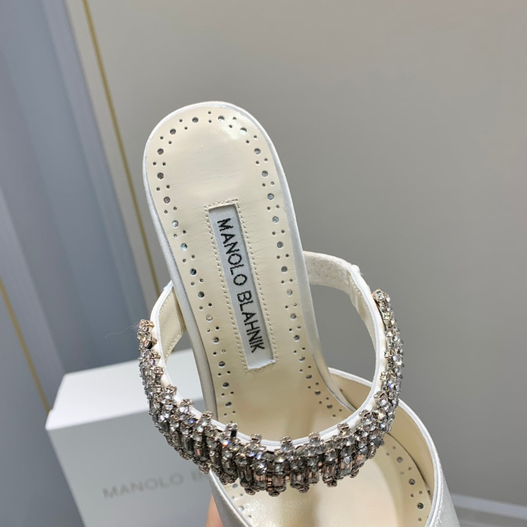 Manolo Mules Diamond Buckle White Silk Satin 218814