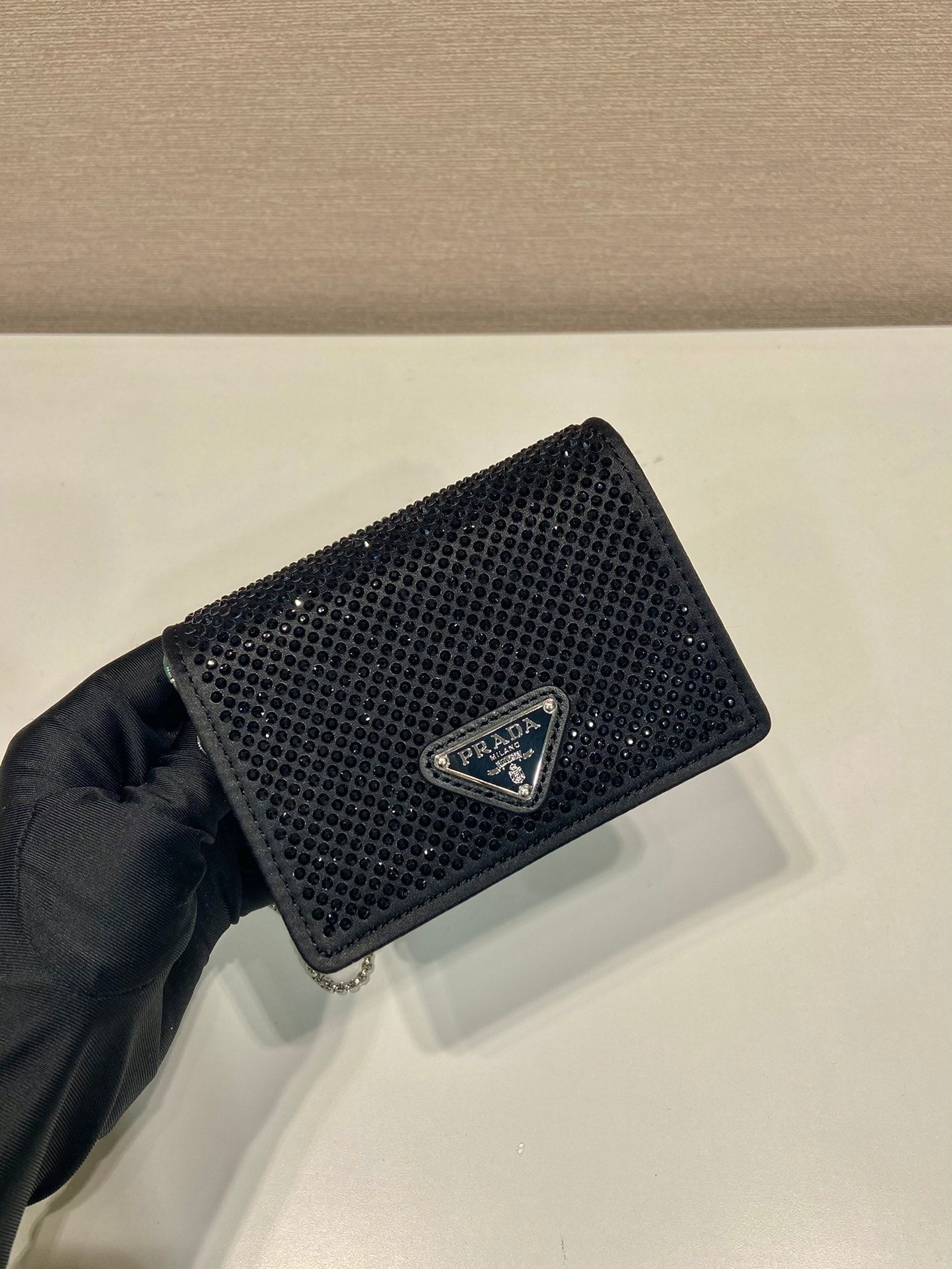 MINI FLAP BAG 11 IN BLACK DUCHESSE FABRIC ATTACHED FULL CRYSTALS SILVER CHAIN