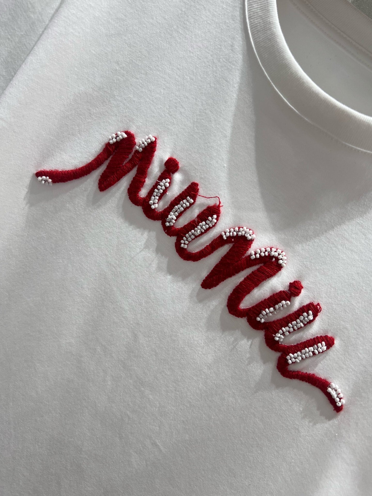 Miu Miu 25 Beaded Short Sleeve T-shirt White Red Cotton 210556