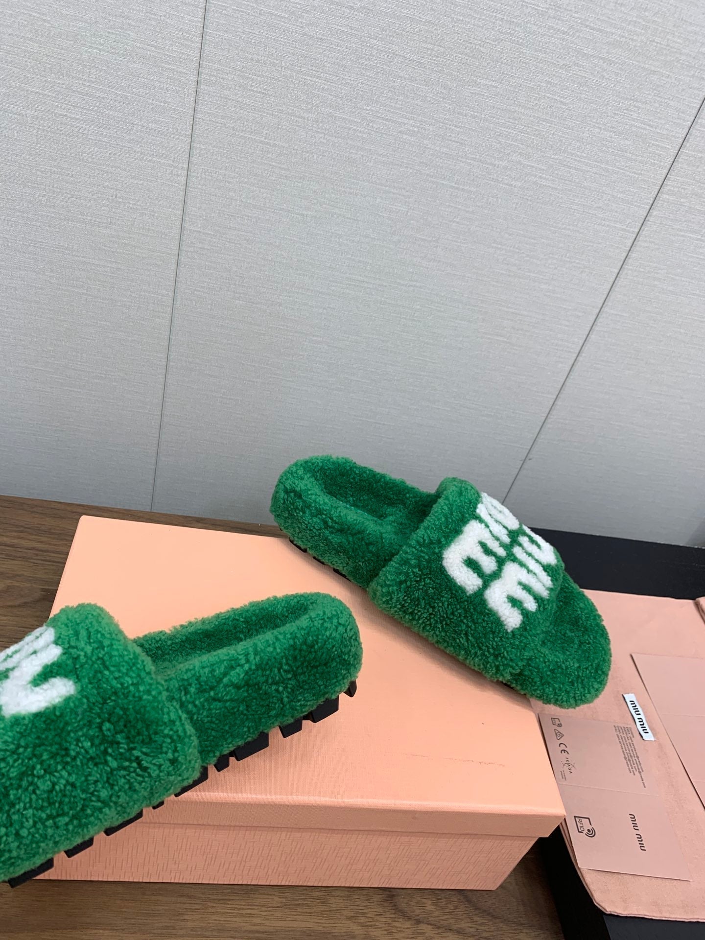 Miu slippers Green With White Lettering Pure Wool