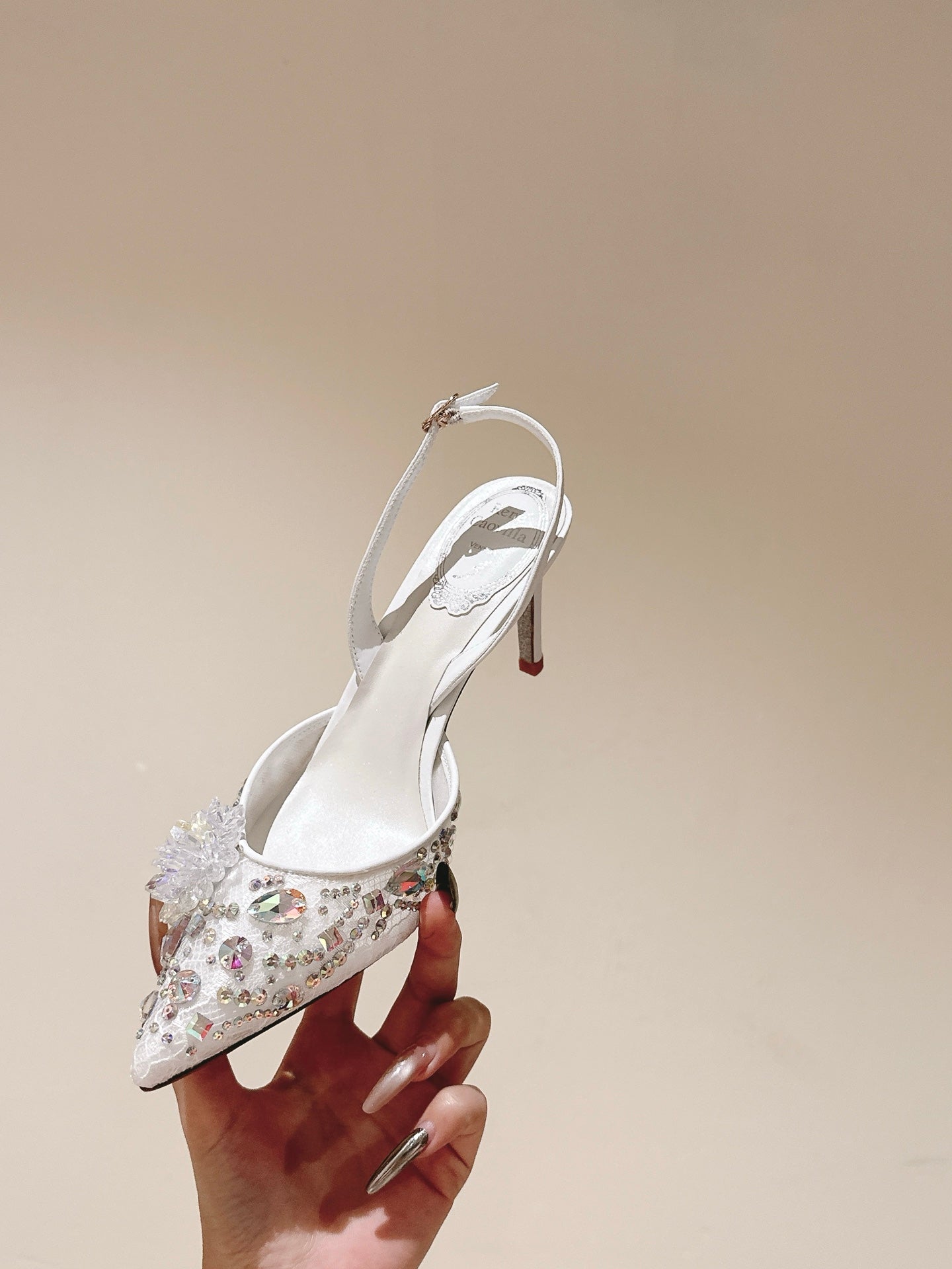 RC 25C Slingback Lace Mesh High Heel 7.5cm White Silk Rhinestones 268082