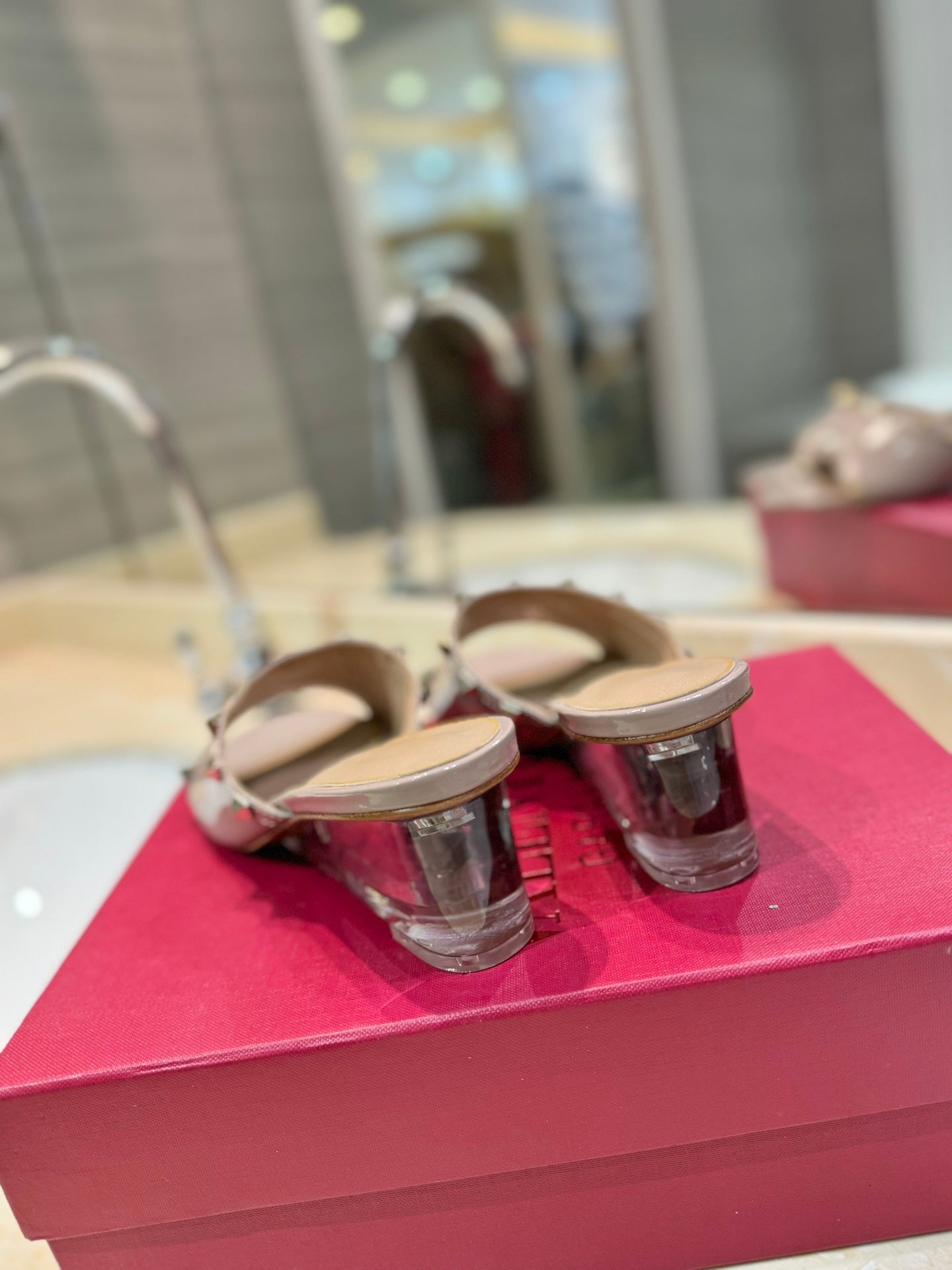 ROCKSTUD MULE SANDALS WITH TRANSPARENT HEEL IN CREPE PINK CALFSKIN