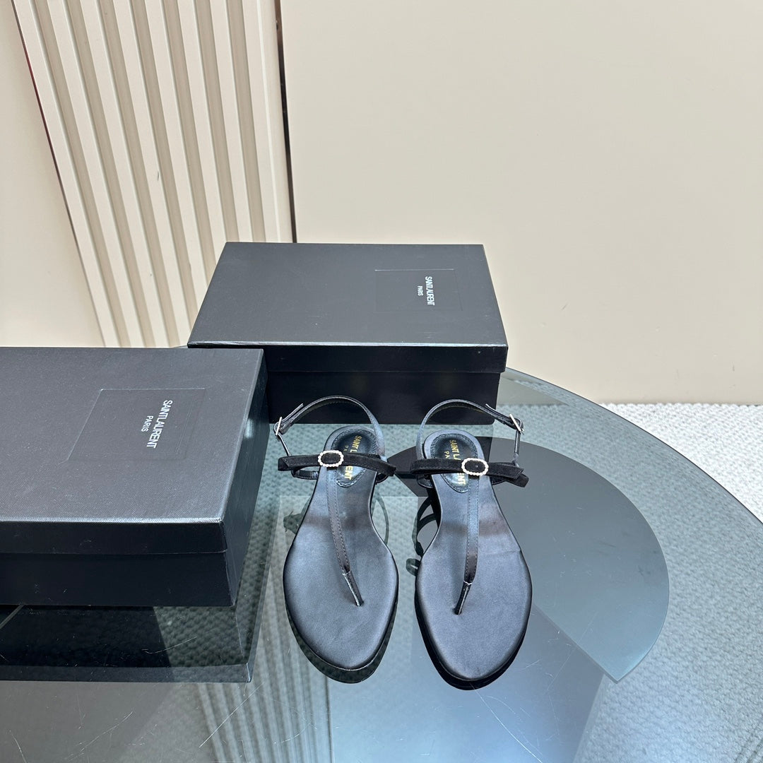 SL CRYSTAL T-STRAP FLAT SANDAL BLACK SATIN
