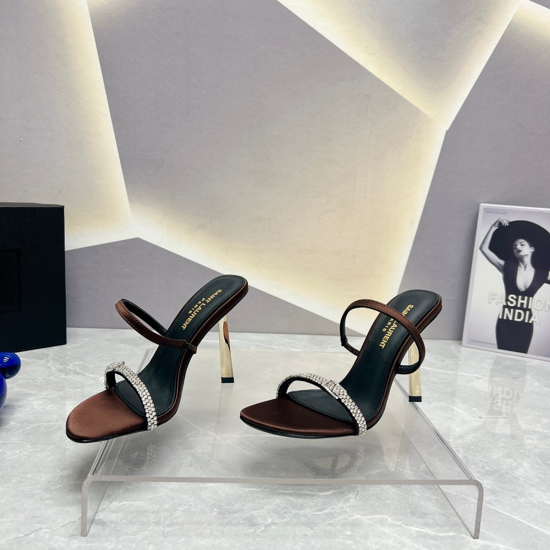 SL CRYSTAL THIN BELT HIGH HEELS BROWN SATIN