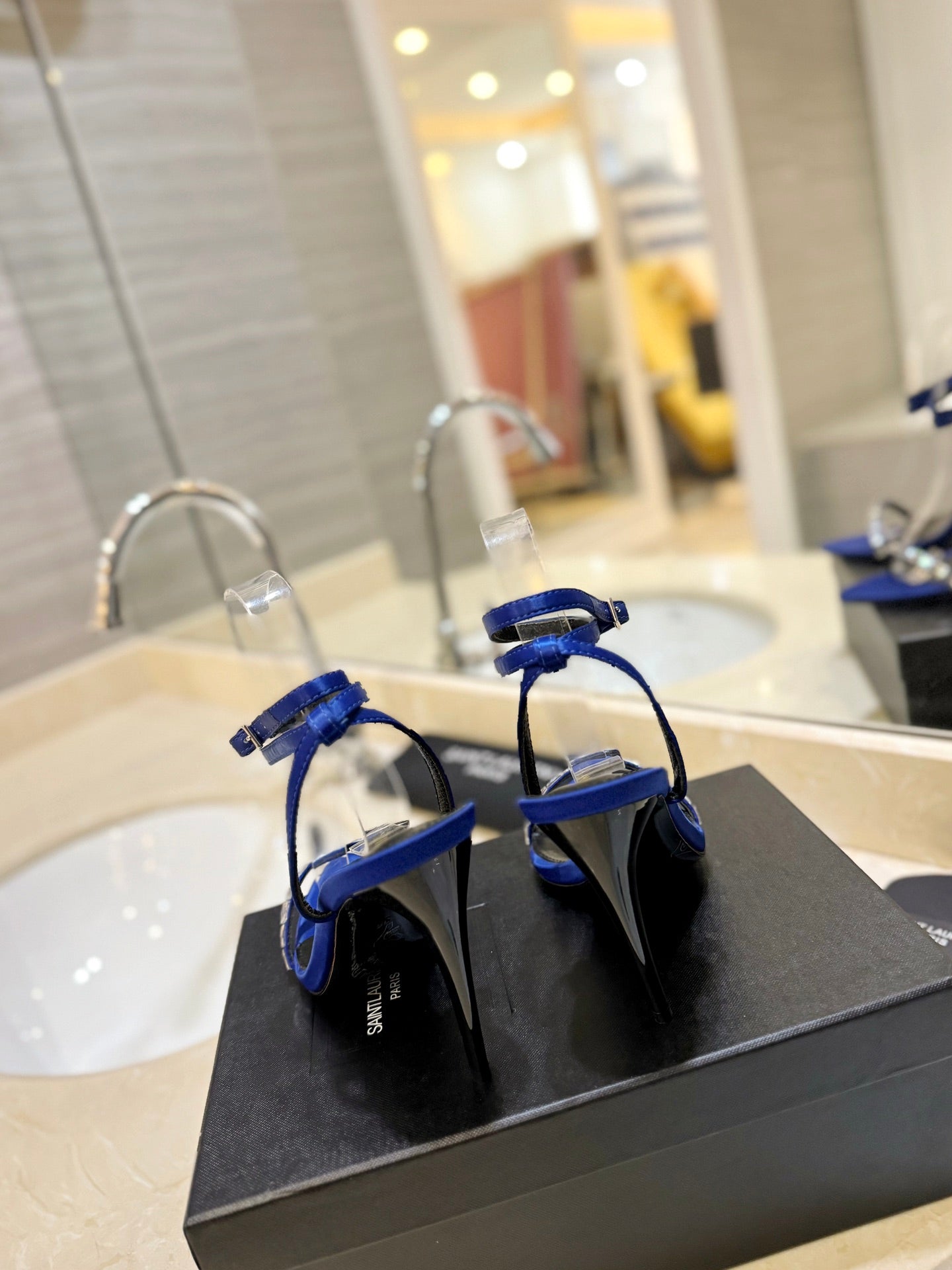 SL RHINESTONE HEELED SANDALS COBALT SATIN