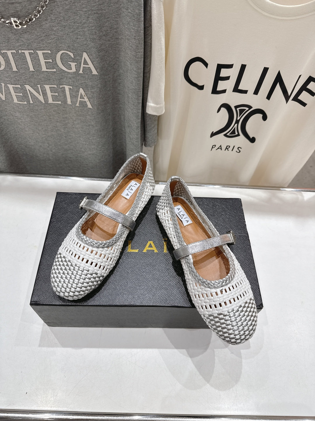 ALAIA MARY JANE FLATS white mix gray woven calfskin pattent
