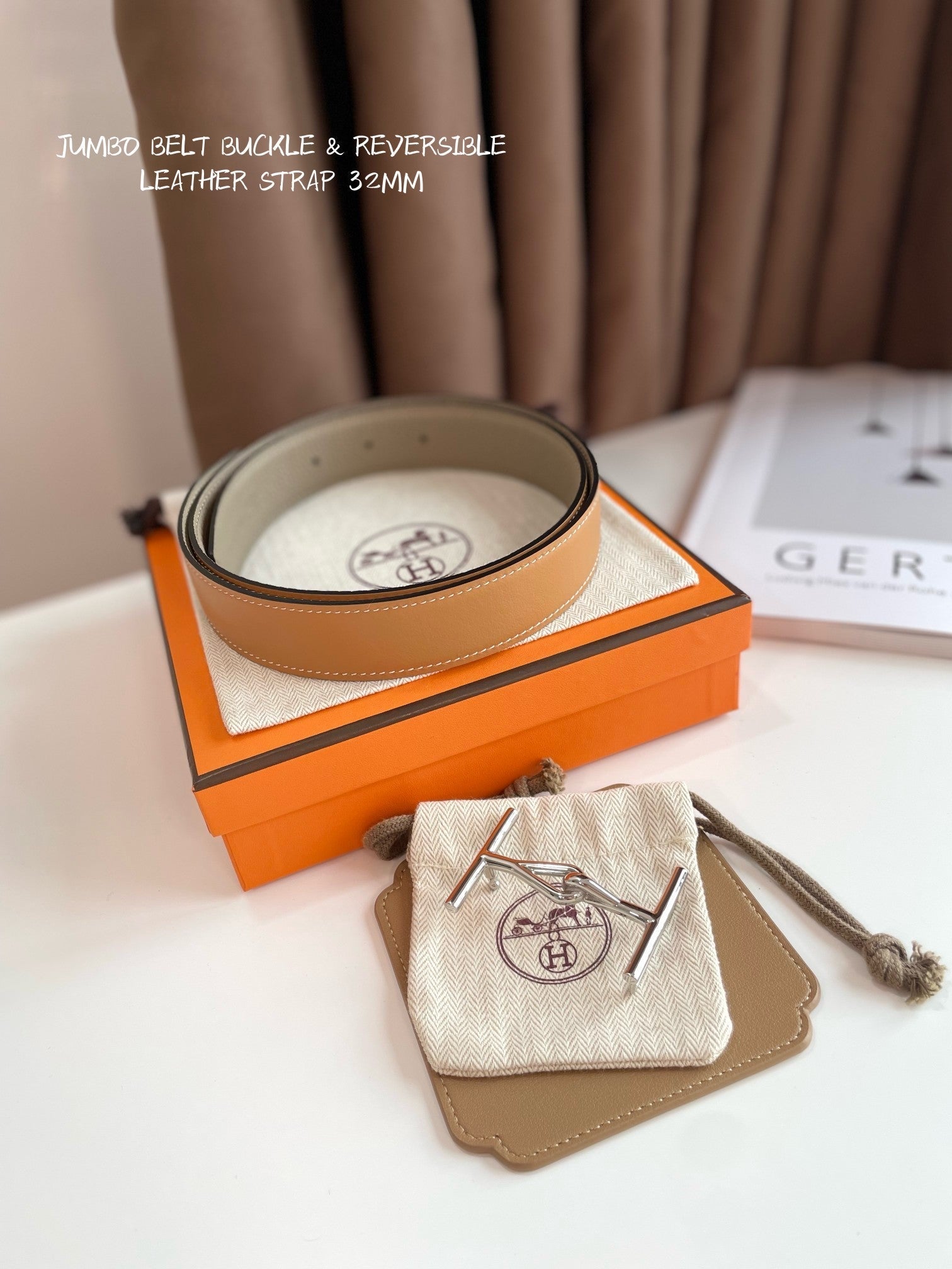 JUMBO BELT SILVER BUCKLE & REVERSIBLE CAMEL BROWN AND ORANGE LEATHER STRAP 32MM