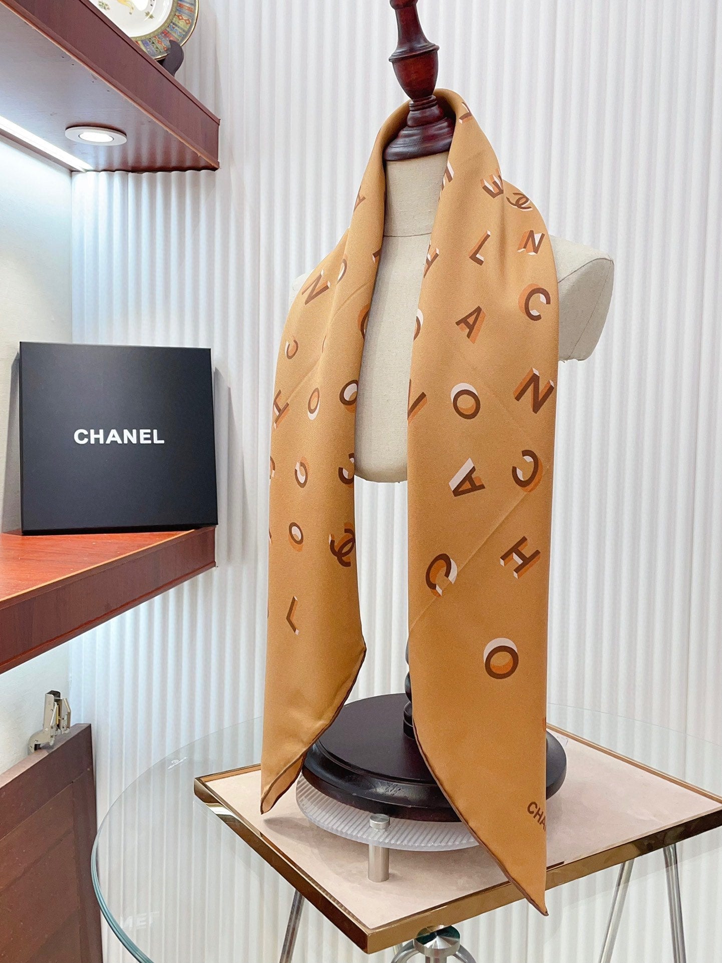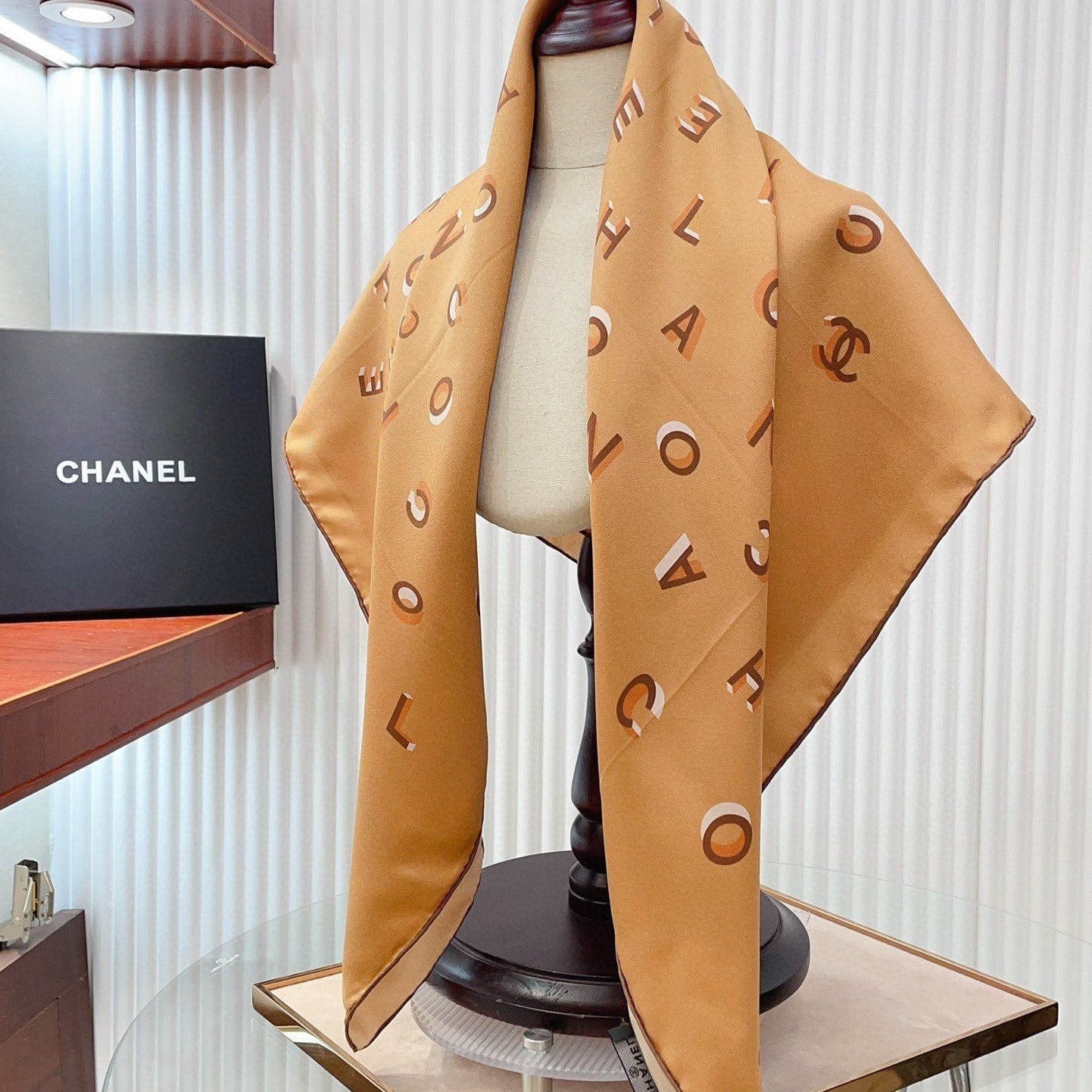 CC Square Scarf 90 CM In Dark Beige With Printed Letters Silk Twill 300436