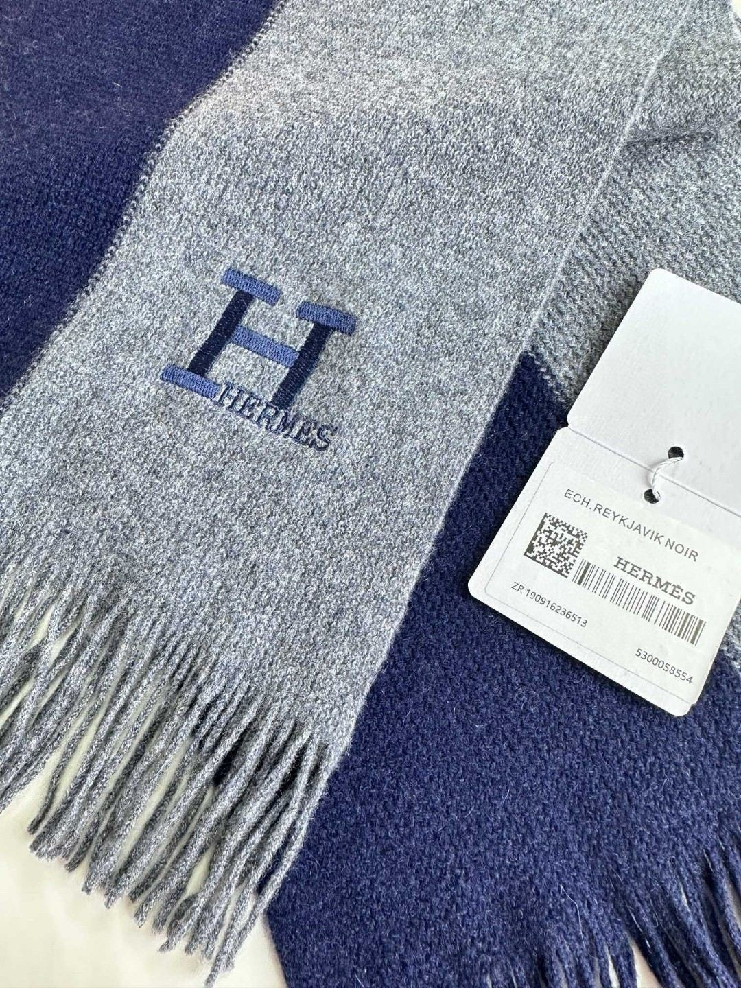 SCARF 180 CM IN NAVY BLUE MIX GREY CASHMERE WITH EMBROIDERED LOGO