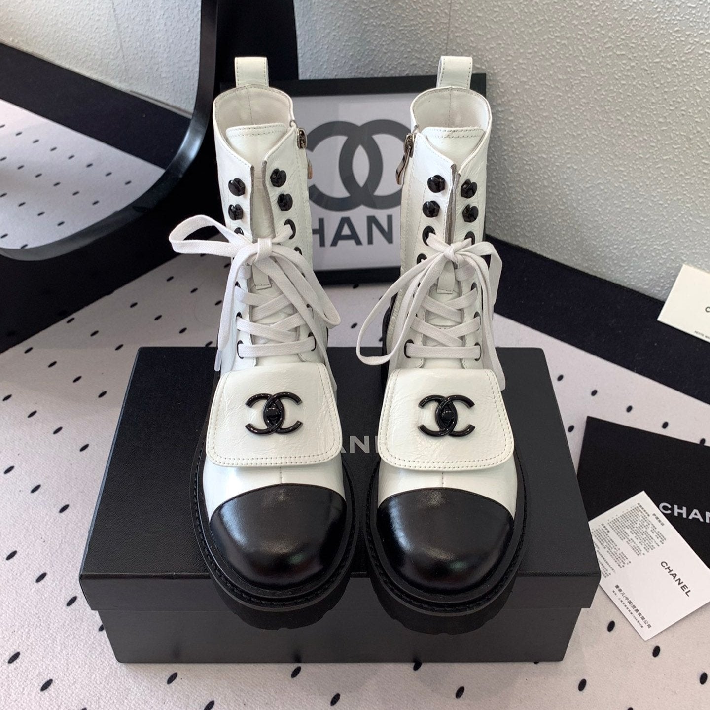 CC Combat Boots White Black Quilted Lambskin 944574