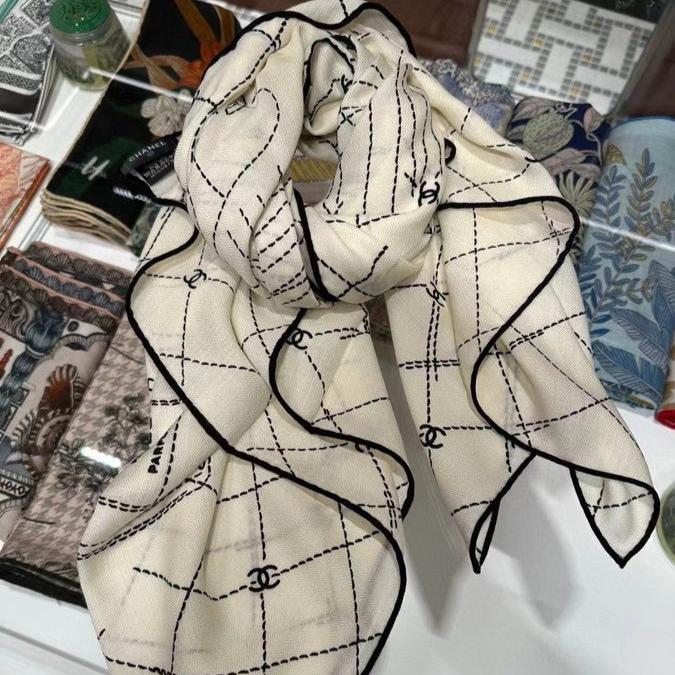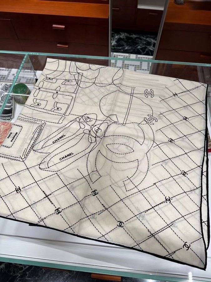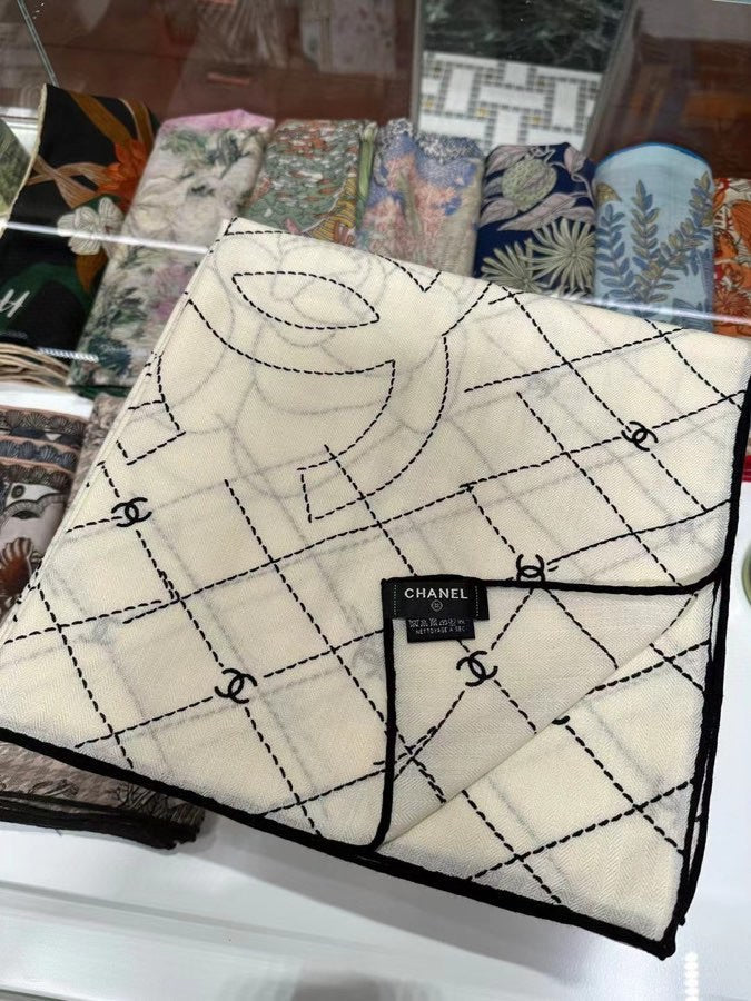 CC Square Scarf 140 CM In White Black Cashmere Silk 373590