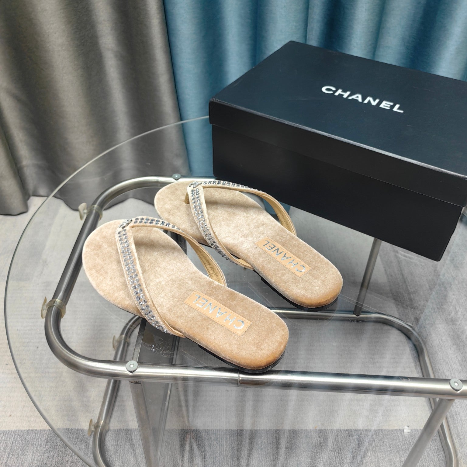 CC Thong Beige Velvet Silver Strass