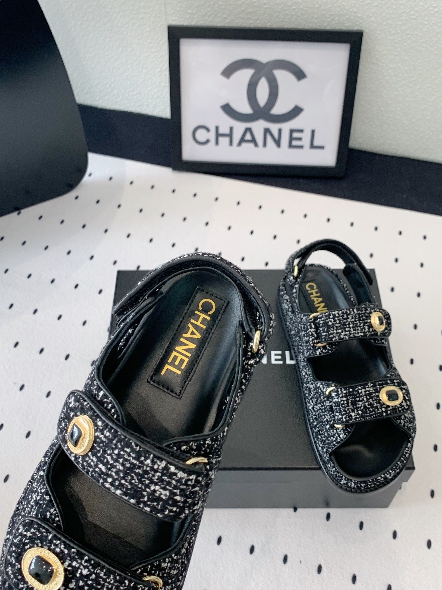 dad sandal black white tweed